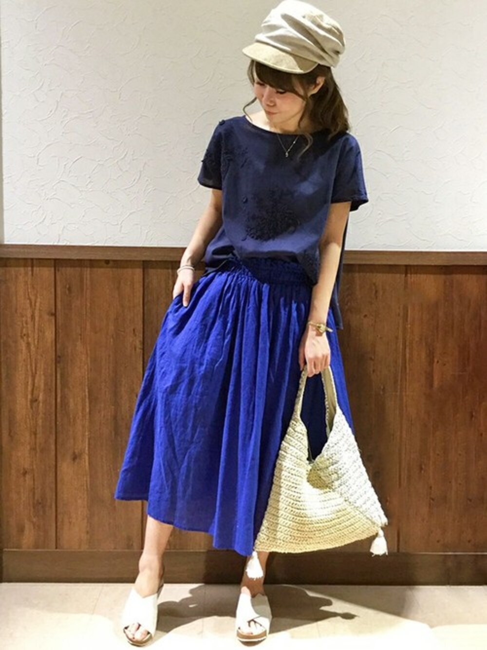 ゴールデンウィークおすすめコーディネート♪ シンプルに見えつつ、モチーフレースをあしらったこだわりのトップスに、涼しげなリネン素材のスカートをあわせました。 ブルー系でまとめたウェアに白系の小物使いが爽やかな印象に。