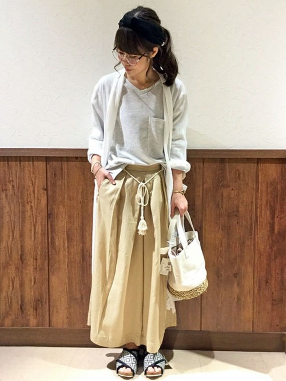 ライトカラーでまとめた休日のおでかけコーディネートです。 トップスは、ロングカーデをさらっと羽織ってアクセントに。 ボトムは、ゆったりシルエットながら、テンセルツイルを使用したキレイ目に見える万能パンツ。 タッセル付きのコードベルトが今年らしいポイントになっています♪