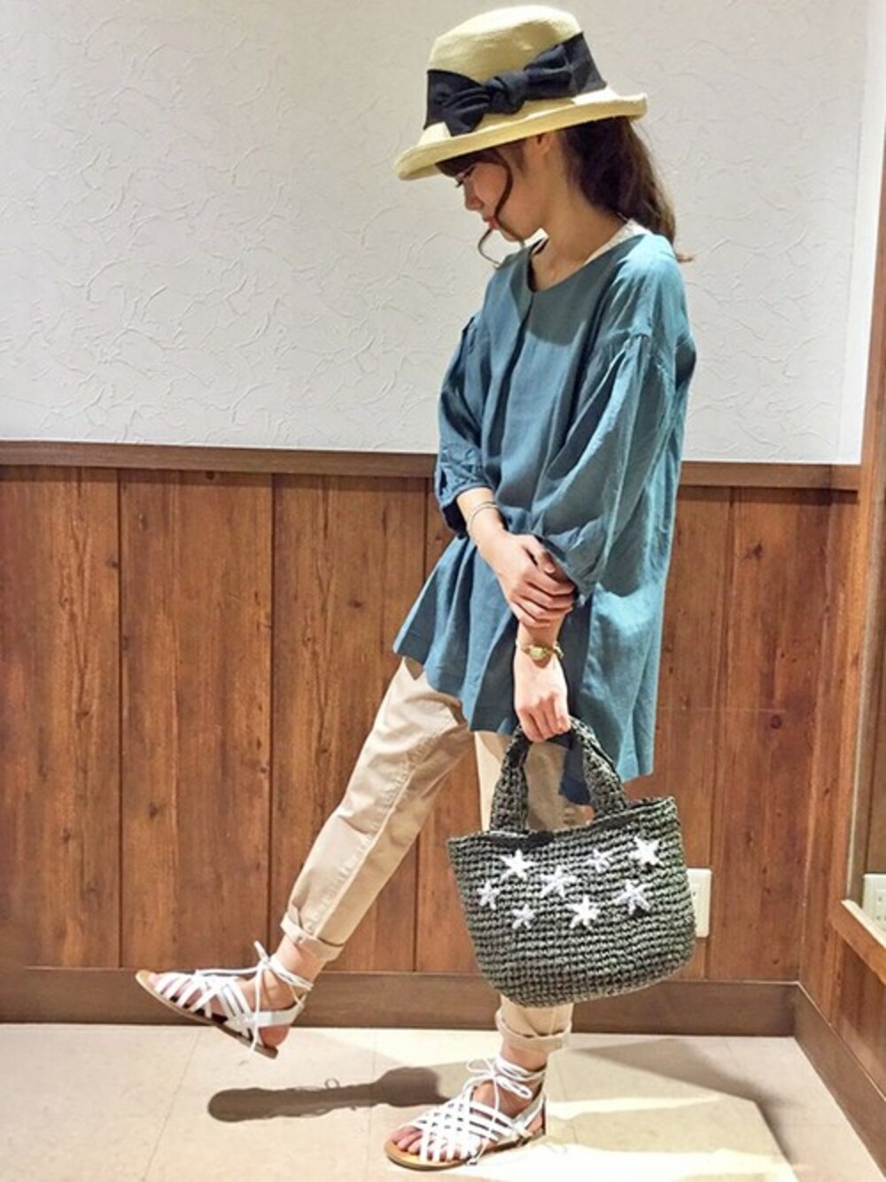 夏のリラックスコーデ。 ぱきっとしたきれいな発色のプルオーバーは、今年らしいボリュームシルエットで、前後どちらもV開きになったヌケ感のあるデザインです。 後ろ丈が長めなので気になるヒップラインもおしゃれにカバーしてくれます♪ 夏素材の小物あわせでリゾート感をプラスしてみました。