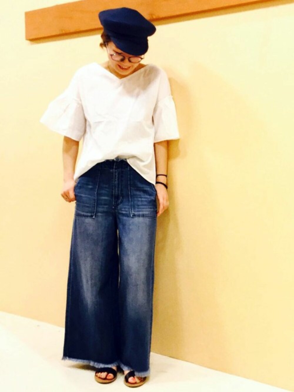 この夏のシンプルデニムスタイル。 今年らしいボリューム袖のブラウスにワイドデニムをあわせました。 それぞれいつもの定番アイテムに今年らしさが加わったおすすめコーディネートです。