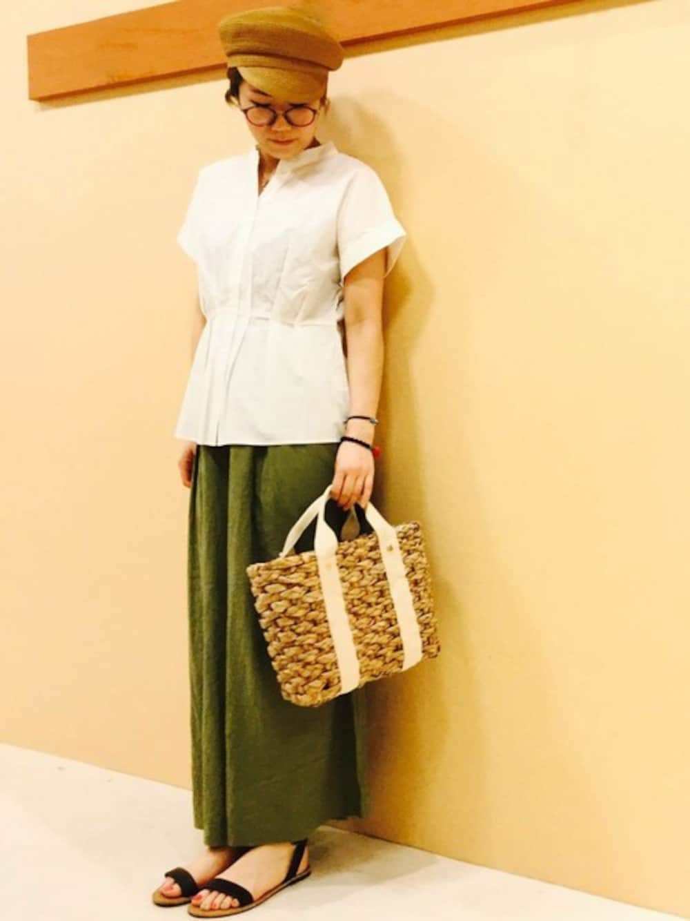 夏のおでかけコーディネート。 トップスは、タックでウエストマークしたペプラム風のブラウス。 ハリのある生地とトレンドのスキッパーカラーがポイントになっています。 きれいめコーデはもちろん、涼しげな麻混のボトムとあわせても◎ 夏小物をあわせればリゾート感もUPします♪