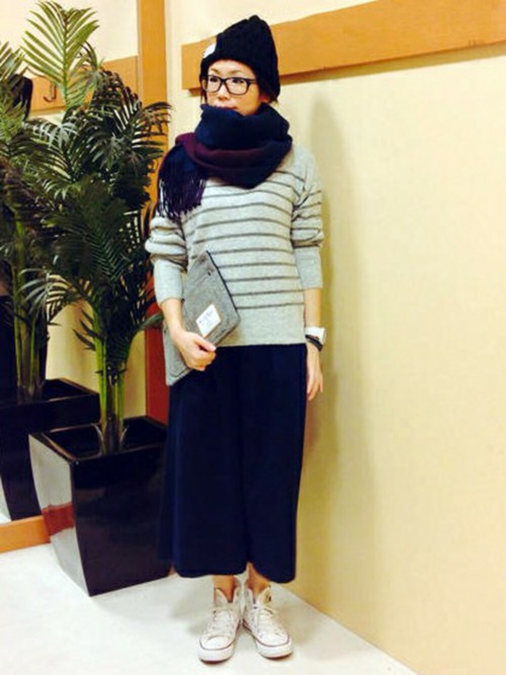 デイリーにおすすめの大人カジュアルコーディネートです。 もちっとした肌触りが心地よいボーダーニットは、少し長め丈で着になる部分をカバーしてくれるうれしいアイテム。 スカートのような雰囲気のガウチョパンツとあわせれば、今年らしい着こなしになります。 全体的にゆったりとしたシルエットなので、ストールを首元でボリューム巻きにしてバランスよく♪