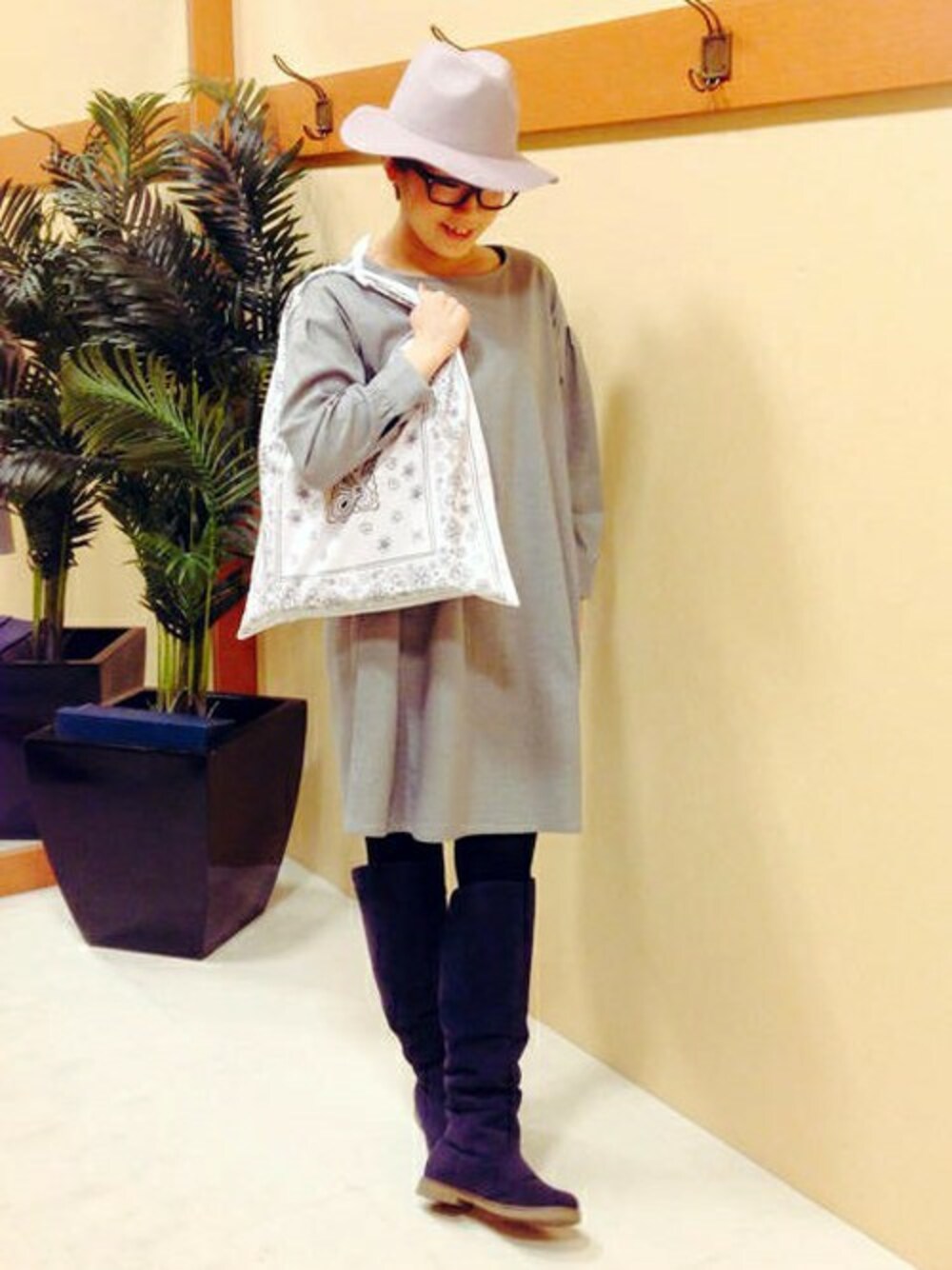 ラフなワンピーススタイルです。 ボリューム袖とゆったりしたシルエットのワンピースは、動きやすく着やすさ◎ シンプルで小物あわせを楽しめるのもうれしいポイントです。 全体をグレーでまとめたシックなスタイリングに、この春注目のバンダナ柄のショルダーバッグをあわせました♪