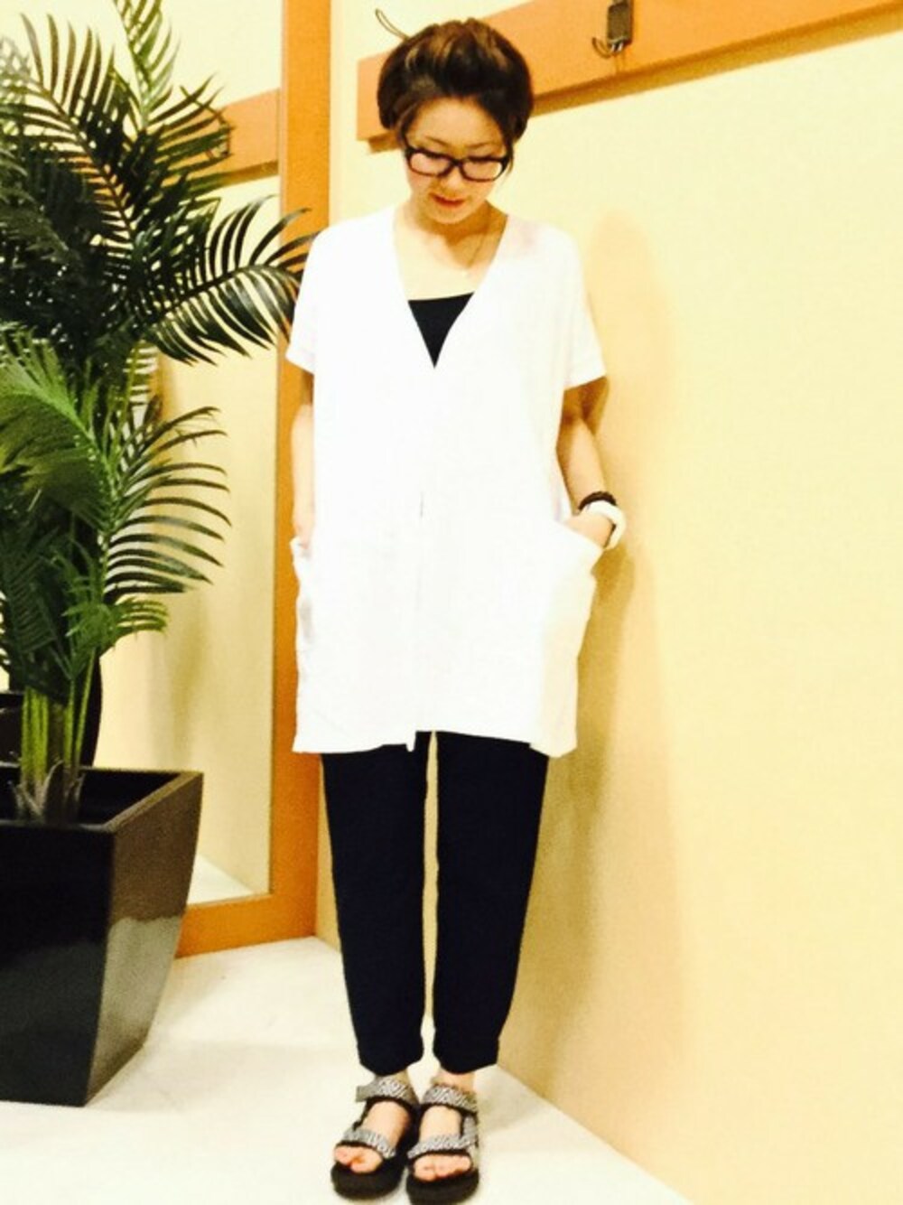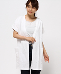半袖カーディガンを使ったコーディネート。 ロング丈で前ボタンをとめるとチュニックの様に着回せるアイテム。 モノトーンでまとめ大人カジュアルなスタイリングにしてみました。