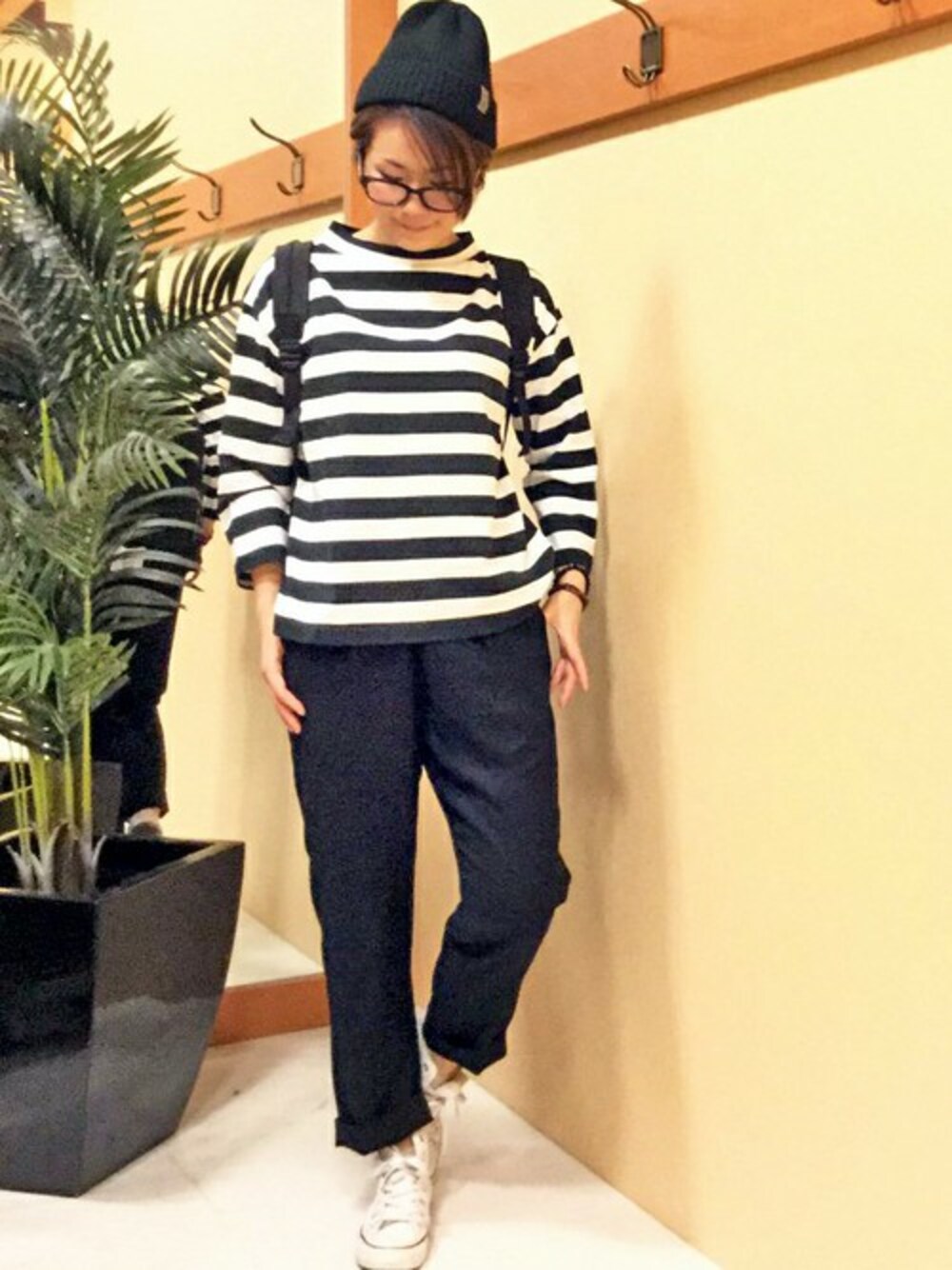 メンズライクなカジュアルコーデ♪ 太ボーダーがかわいいトップスは、ボトルネックが今年らしいポイントになっています。 ボトムにはらくちんテーパードパンツをあわせてラフにまとめました。