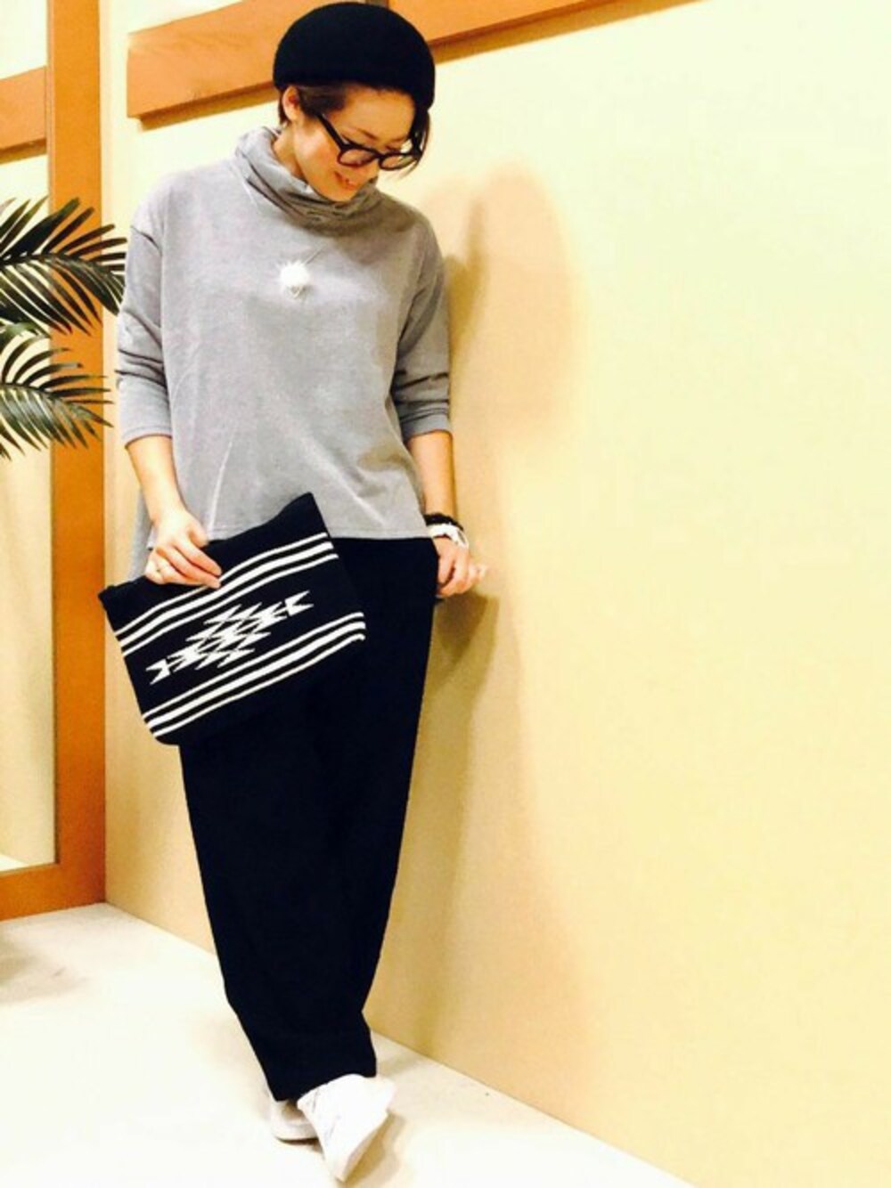 ゆるっとしたオフタートルのトップスにワイドパンツを合わせたメンズライクなスタイル。 グレーのトップスは、優しい広がりのAライン&前後差のある着丈など、今年らしいシルエットが特徴の一枚です。 小物もモノトーンでまとめて大人の印象に♪