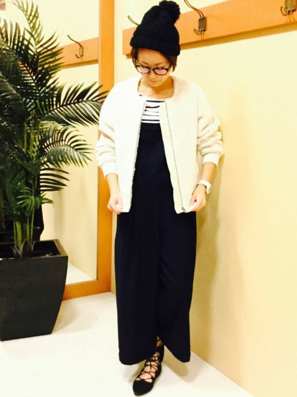 休日におすすめのモノトーンスタイル。 ボア素材で柔らかな雰囲気のノーカラーブルゾン。ホワイトのボアが今年らしい一枚。 きれいめサロペットとレースアップシューズに合わせて、大人可愛くシンプルに仕上げるのが◎