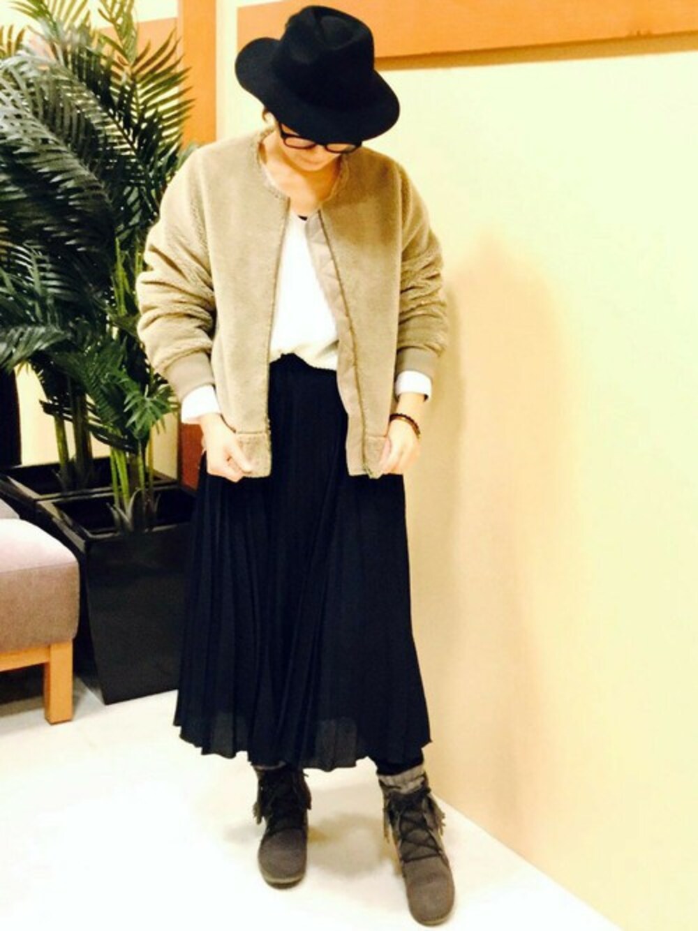 モノトーンコーデに相性◎のベージュをプラス。 この冬注目のボアブルゾンは、辛口な印象の中にもボア素材で柔らかな雰囲気です。 甘口ラインのスカートに、つば広ハットとハードなブーツに合わせると今年らしい着こなしに♪