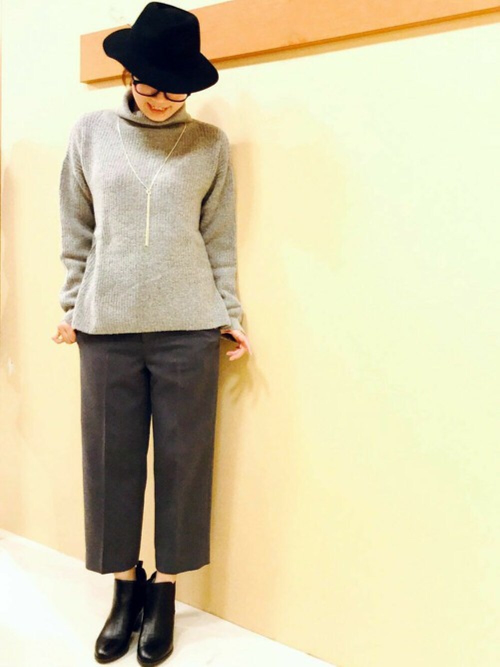 クロ&グレーのワントーンでまとめた大人の女性らしいパンツスタイル。 ふっくらとした優しい雰囲気のニットは、今年らしいリラックスな気分にもマッチする、オフタートルとドロップショルダーのシルエットがポイントです。 ボトムは、ストレート感の強いシルエットが特徴的なシガレットパンツ。あえてのクロップド丈でショートブーツやスニーカーなど足元ファッションを楽しめます♪