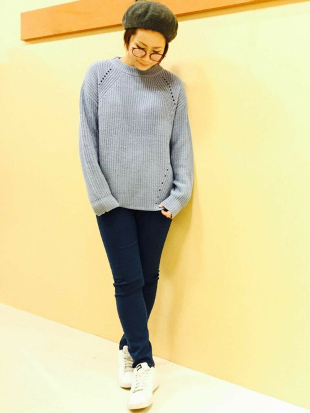 春カラーを取り入れたデニムコーディネート。 しっかりとしたきれいな凹凸の畦編みニットは、優しいAラインが特徴。 シンプルにデニムとあわせつつも、小物使いでワンランク上のデイリースタイルに♪