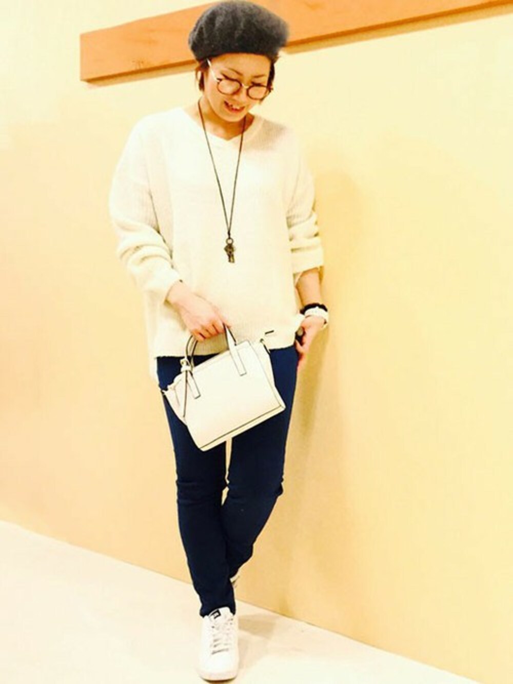 ゆったりシルエットのトップス×すっきりボトムの定番コーディネート。 シンプルなので、小物使いを楽しめるスタイルです。 全体をモノトーンでまとめると、大人の女性らしいカジュアル感をプラスしてくれます♪