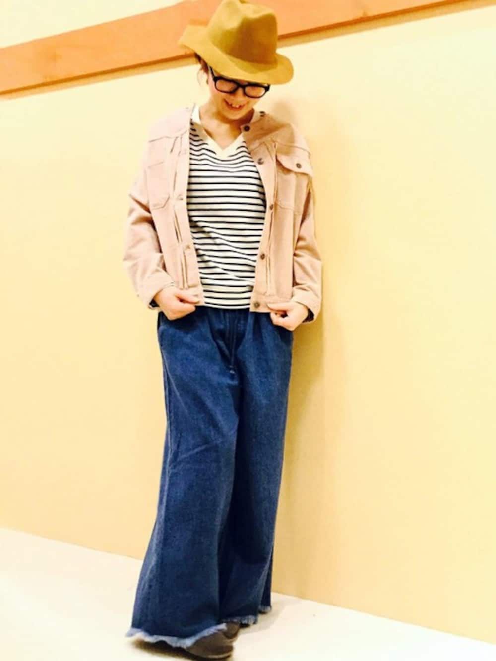 ボーダー×デニムの王道スタイルを今年らしくアレンジしてみました。 リラックスな着用感と気軽さがうれしいウエストゴムのデニムパンツは、裾も切りっぱなし加工でフリンジにすることで、シンプルなトップスを合わせても雰囲気のあるスタイリングに仕上げてくれます。 やさしいカラーのブルゾンをあわせれば春の装いに♪