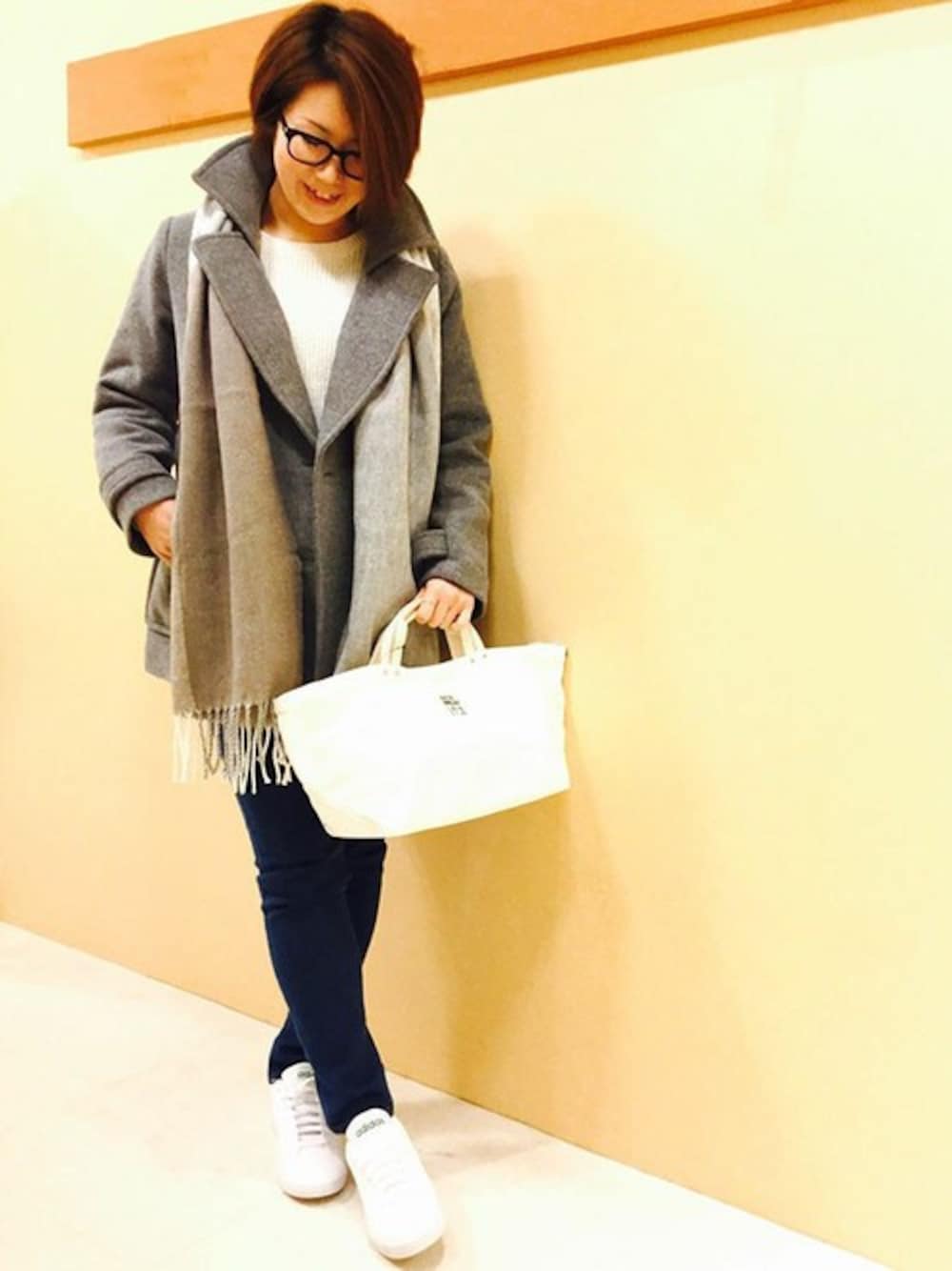 大人のPコートスタイルです。 コートにストールをラフに羽織るとグッと大人の雰囲気に♪ すっきりスキニーとシロの小物使いでシンプル&カジュアルを意識しました。 使いやすく合わせやすい、デイリーアウターとしてしっかり活躍してくれる一着です。