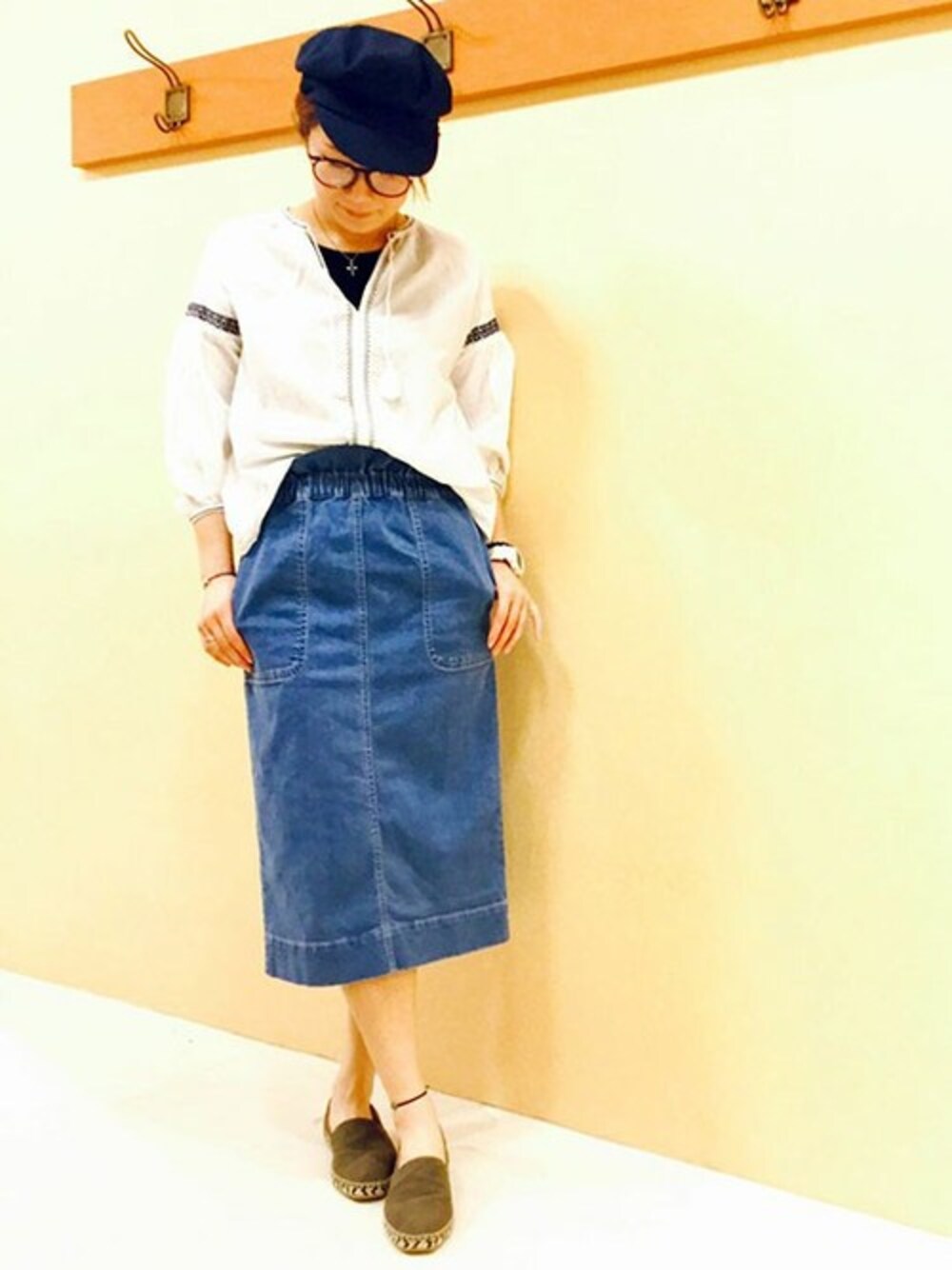 シロ×デニムの夏コーデ。 トップスは、夏になると取り入れたくなるエスニック気分の刺繍をさりげなく取り入れたブラウス。 パンツはもちろん、スカートの相性も◎