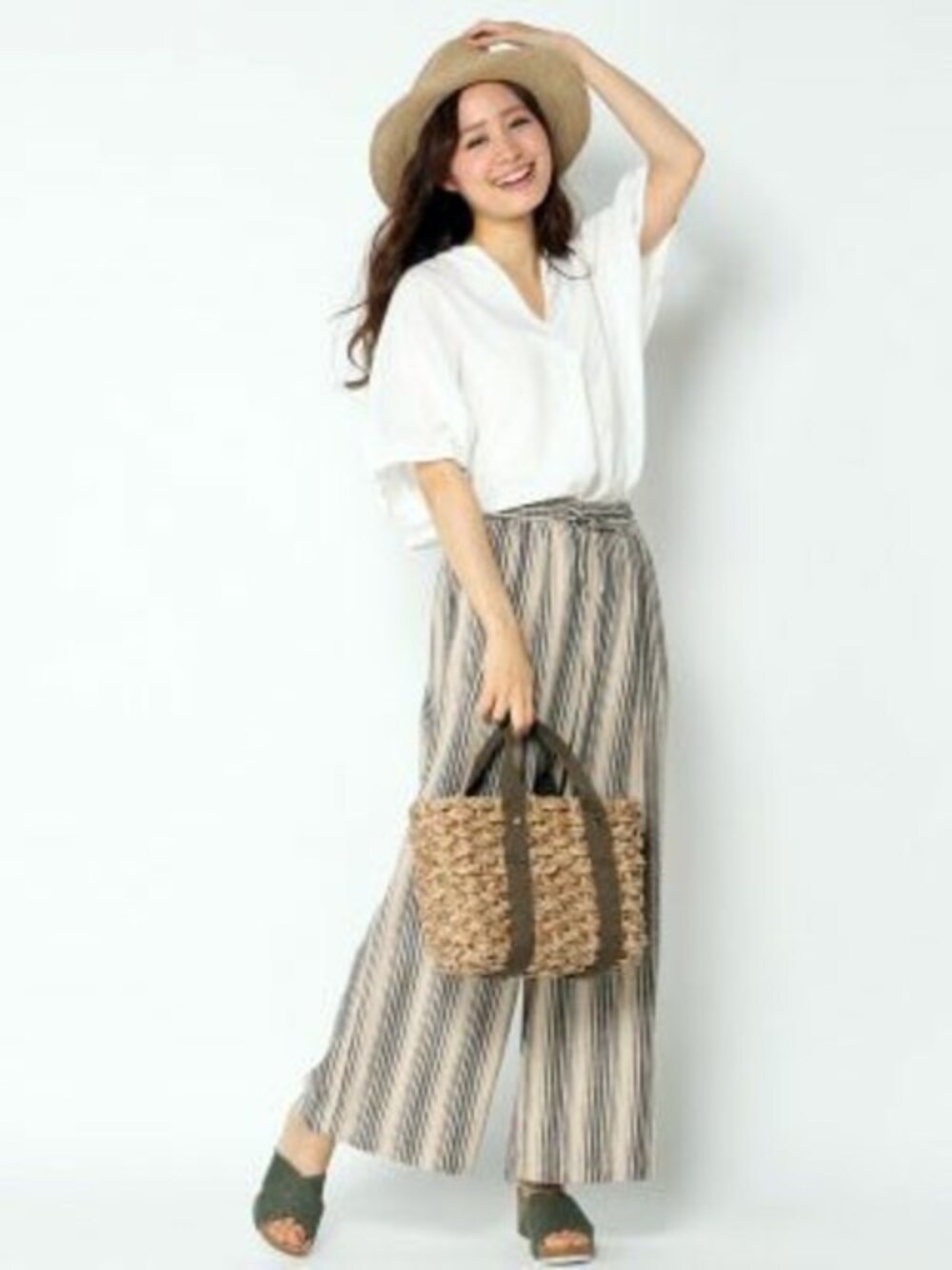 夏のおすすめパンツスタイルです。 シンプル&クリーンなスキッパーブラウスに、風通しのよい涼しげなワイドパンツをあわせたコーディネート。 小物次第でキレイめにもカジュアルにもアレンジできます。夏素材ならリゾート感のある雰囲気に♪
