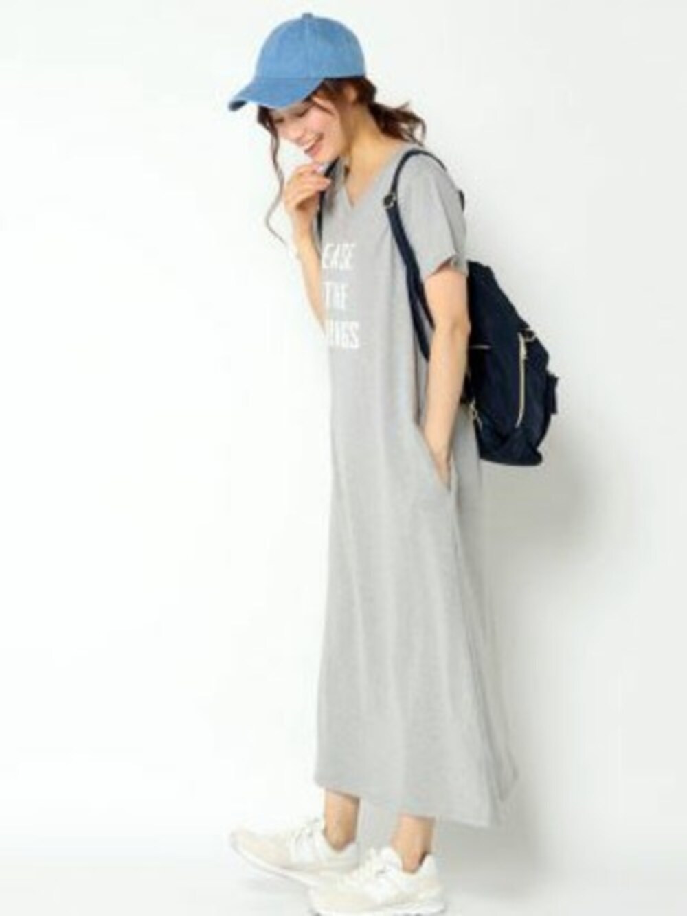 夏のリラックスカジュアルコーデ。 らくちんTシャツワンピースは、カット素材で着心地がよく、体を締め付けないシルエットでゆるっとラクに着られます。 シンプルなデザインで、キャップやリュックなど小物づかいも楽しめます♪