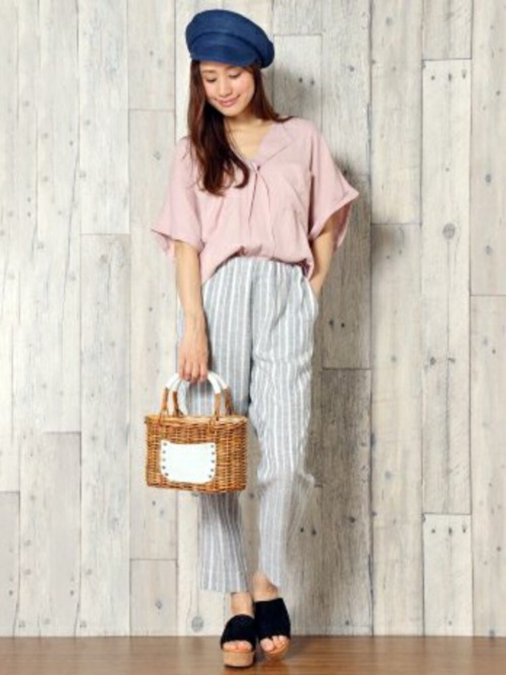 ダスティーピンクのオープンカラーシャツとストライプパンツで大人かわいいマリンコーデ♪ 足元にブラックを合わせれば甘さも抑えてくれます◎