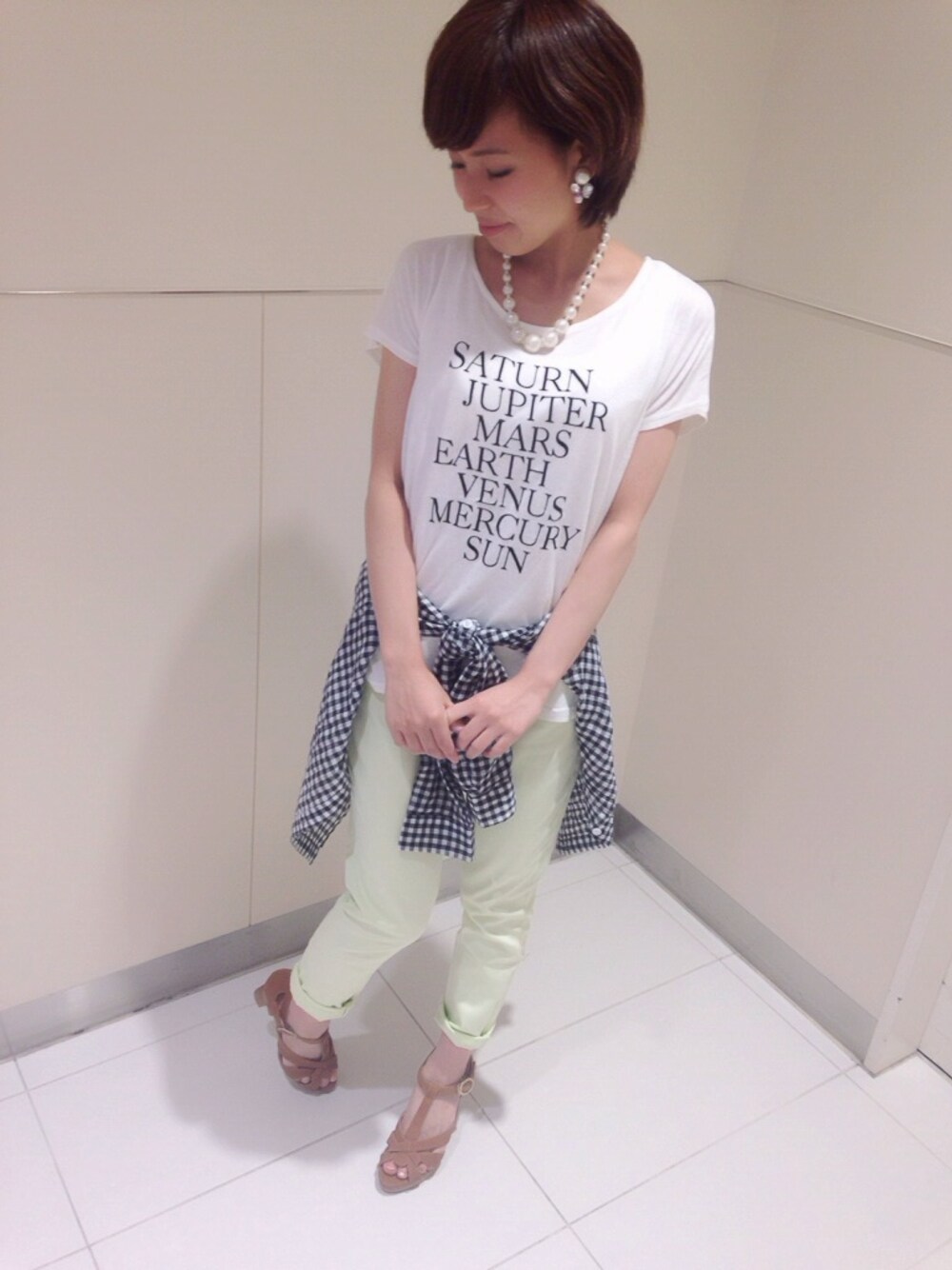 Tシャツにチェックシャツというカジュアルアイテムにイエローパンツを合わせた夏らしいキレイめカジュアルなコーディネートです*\(^o^)/*♡