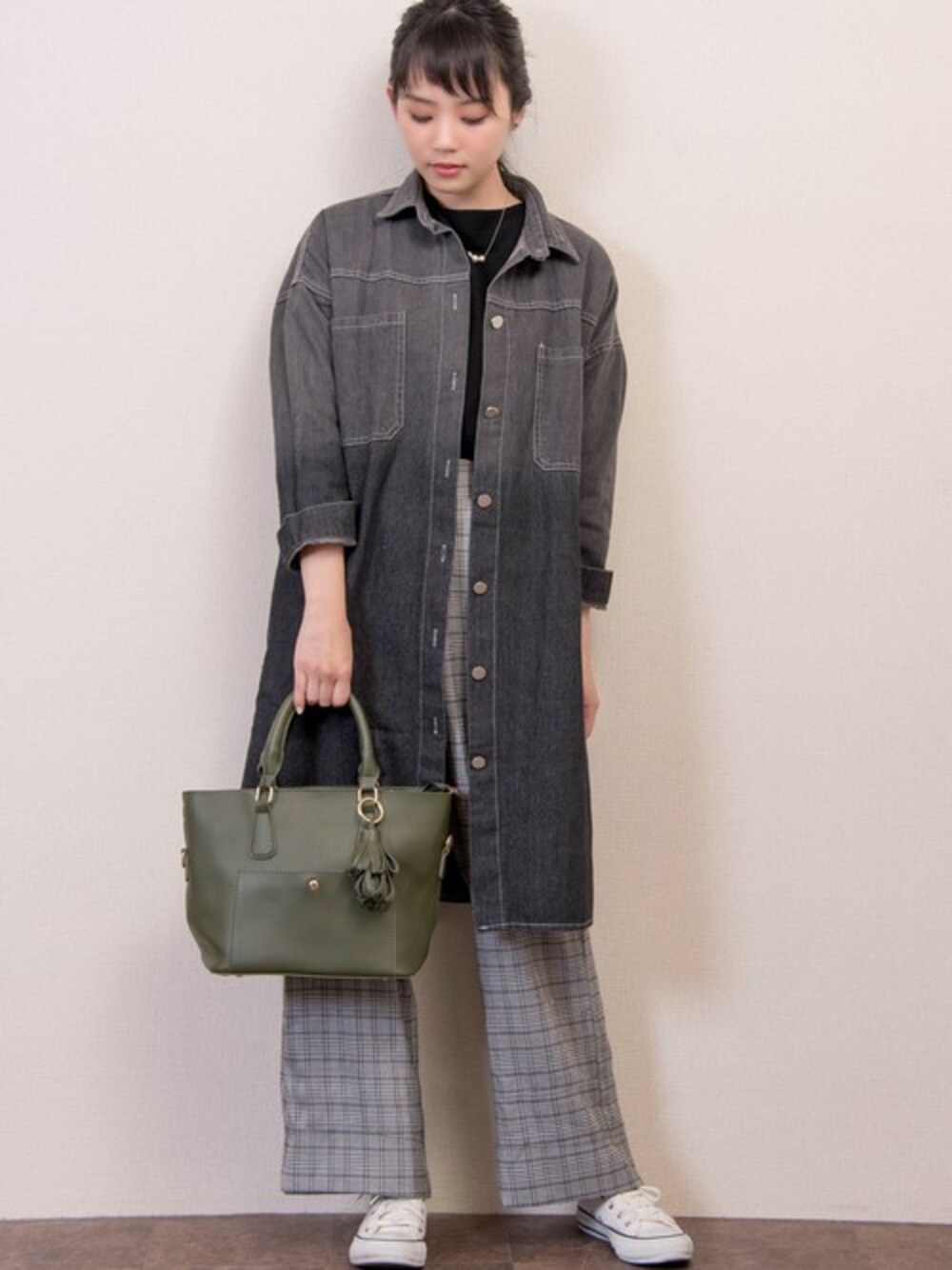 新作のBAG&トレンドの新作のグレンチェックワイドパンツを使ったコーディネートです♪