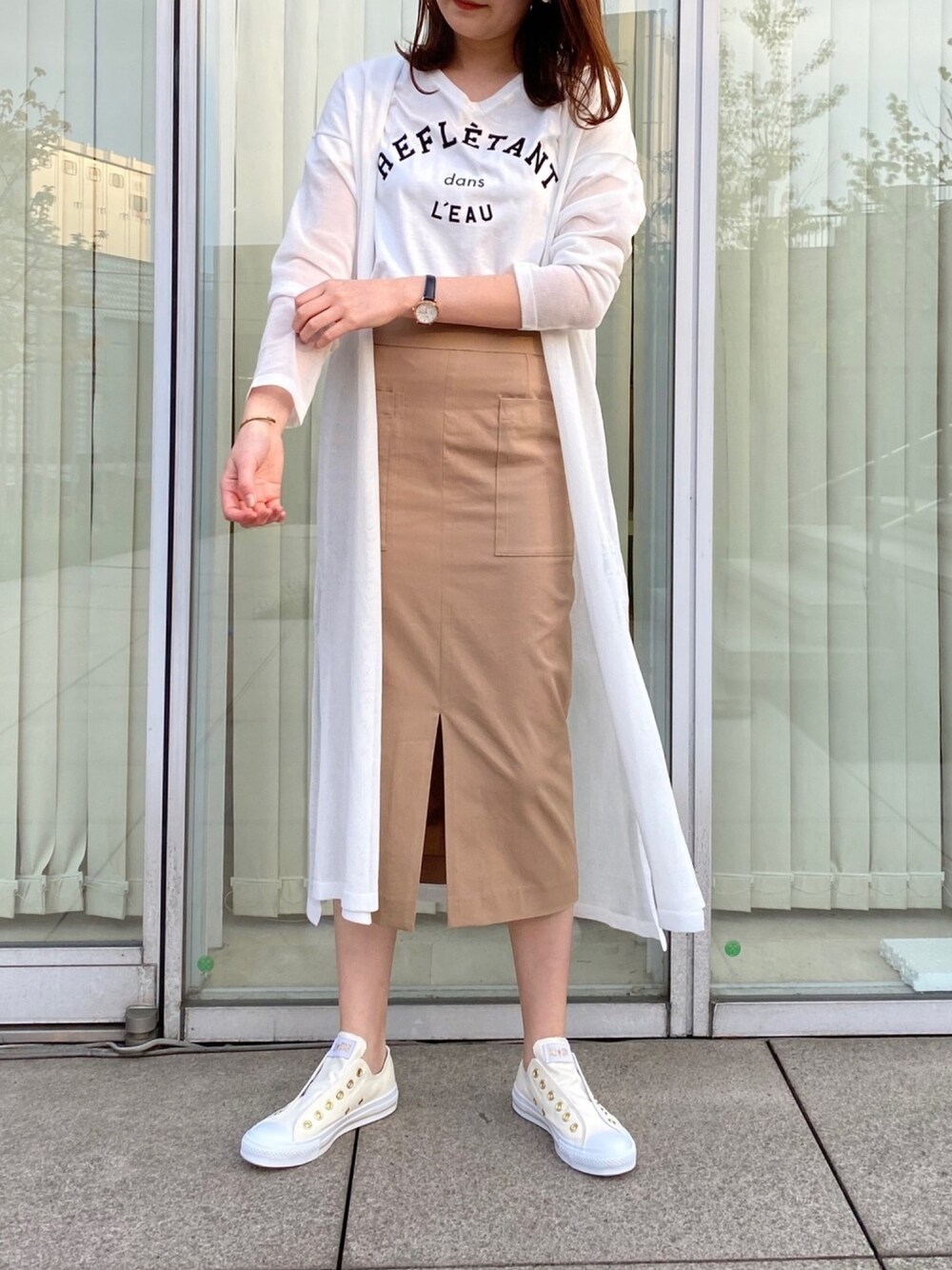 Tシャツ×スニーカー合わせも長めなタイトスカートとカーディガンでカジュアルすぎず、女性らしさを残しつつ🌼 instagram:@ldmoe
