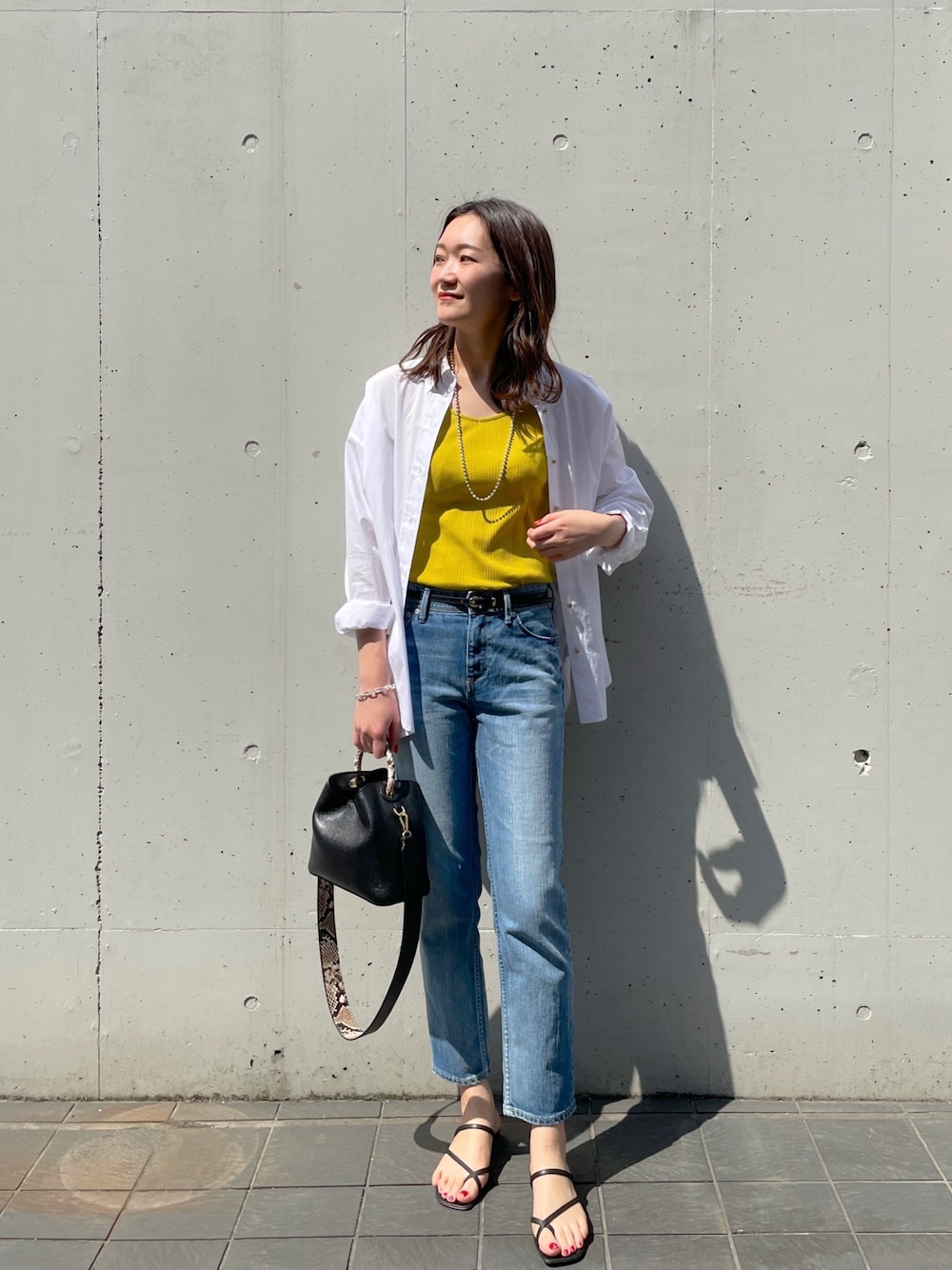 黄色を差し色に🌻 デニム×シャツの王道コーデもカラーが入るだけで新鮮味が♡ instagram:@ldmoe