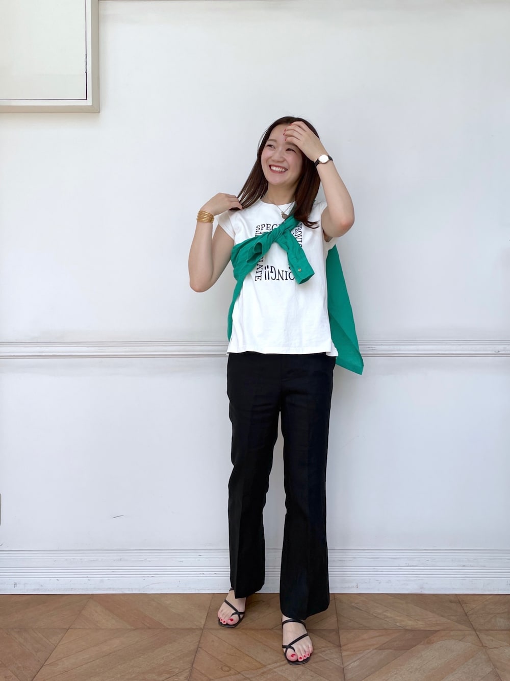 グリーンを差し色に🍏 夏のモノトーンコーデ トップスのフレンチスリーブがちょうど良くて細みえします!! パンツのフレアシルエットも美脚効果抜群! instagram:@ldmoe