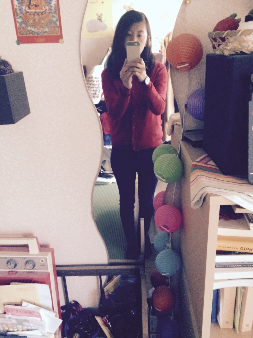 赤カーディガンがポイント