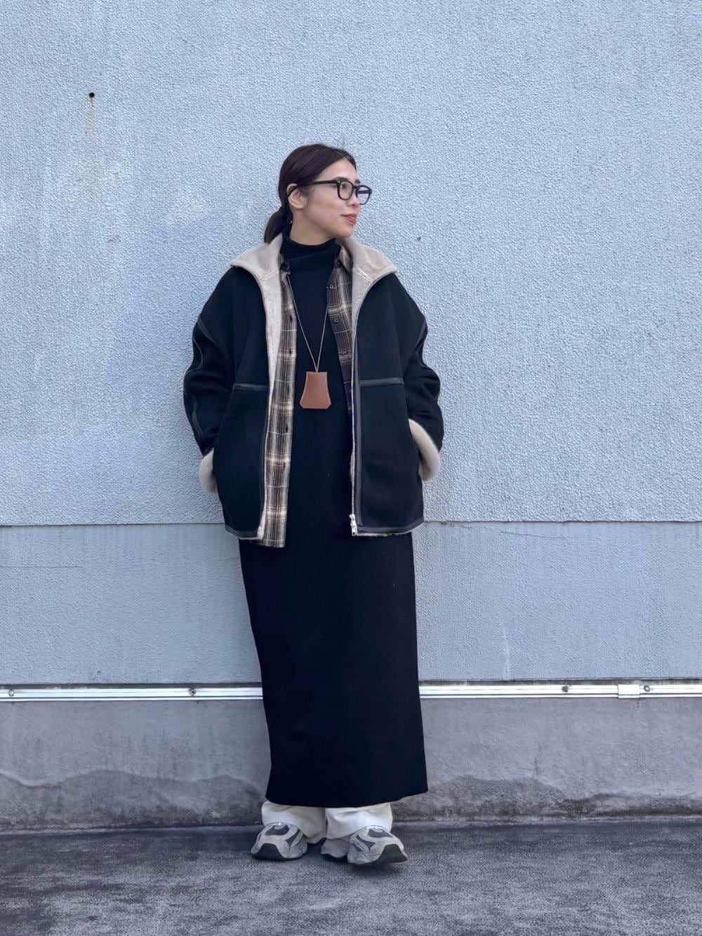 40代前半/154cm/普段サイズ38/着用サイズ アウター38、ニットワンピ38、シャツ38、パンツ36 instagram,WEAR ID/le_juntk 【裏起毛フライトジャケット】 サイズ感:ゆとりがあります 素材感:裏がファーになっているムートン素材で暖かいです柔らかくもやや張りがある素材です 着用感:ゆとりがありインナーも選ばず着られます。 スカートパンツどちらも合わせやすいデザイン 【ウォッシャブルハイネックニットワンピース】 サイズ感:ある程度ゆとりがあります。タートル部分もピッタリしすぎず苦しさは気にならないです 素材感:サラッとして着膨れしないニット素材です 着用感:ゆとりがありニット素材でもシルエットを拾いません。タイツで合わせるのもおすすめ 【チェックオーバーシャツ】 サイズ感:肩落ちで程よくゆとりがあります 素材感:柔らかいですが若干起毛感があり季節感ある素材です 着用感:はおりからインナーまでちょっとしたアクセントに使いやすいです。 落ち着いた配色で子供っぽくならないのも嬉しい。 【ストレッチ裏起毛イージーパンツ】 サイズ感:ゆったりしています 素材感:表はサラッとしており春まで履いていても違和感ありません。裏起毛で暖かい履き心地。 着用感:タックも入っており腰回りにゆとりがあるので普段38ですが36でもシルエットが響きづらくよかったです。