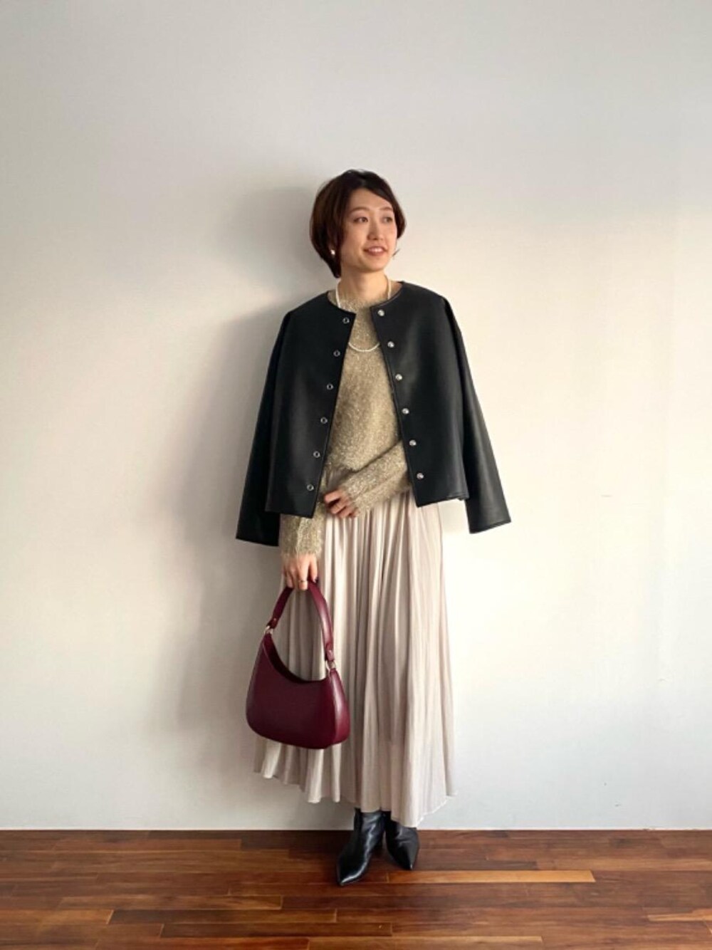 30代前半/167cm/骨格ウェーブ/普段サイズ38〜40/着用サイズ全て38サイズ 【ラメシャギーニットプルオーバー】 サイズ感:ゆったり感のあるサイズで、ヒップにかかる丈。 素材感:柔らかな糸で伸縮性あり。ラメ糸が入り、毛足長め。 着用感:落ち感があるため、裾に生地がたまる感じがとても可愛いです。 【ウエストリブギャザーフレアスカート】 サイズ感:ウエストリブのため、程よいフィット感。足首が見える丈。 素材感:柔らかなふんわりとした生地感。 着用感:動いた時の揺れ感が、綺麗で柔らかな印象に。カジュアルアイテムとも相性抜群。 【ノーカラーリングドットボタン合皮ジャケット】 サイズ感:身幅、袖口ゆとりあり。腰にかかる丈。 素材感:軽く、柔らかな合皮レザー。 着用感:シンプルなデザインで、様々なコーデのポイントに。