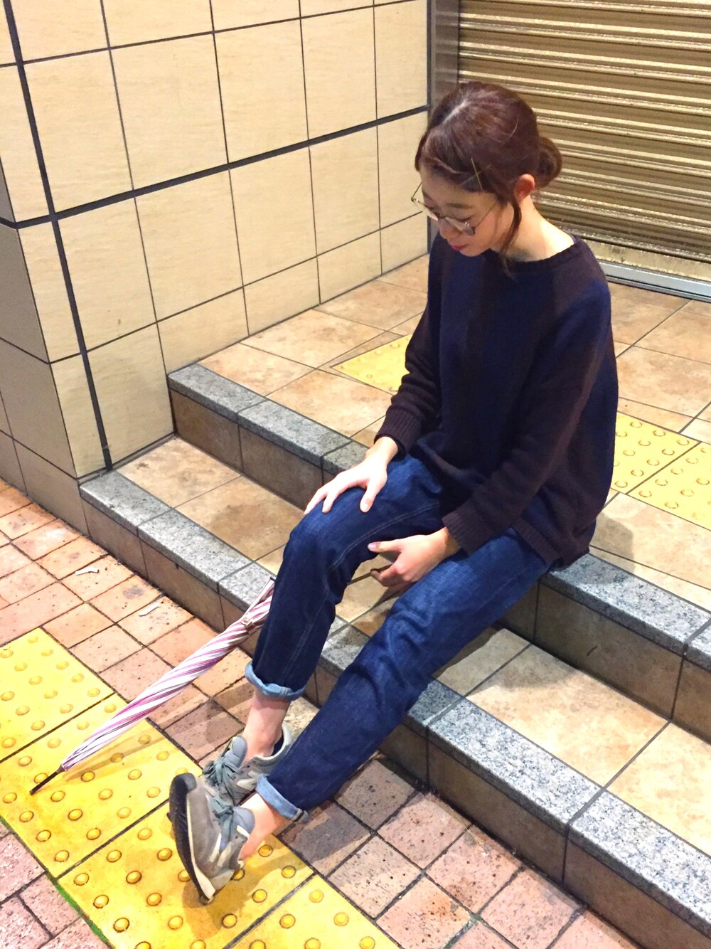 たまにはボーイフレンドデニム! 茶色と紺のストライプがお気に入りのニット〜〜〜😇😇