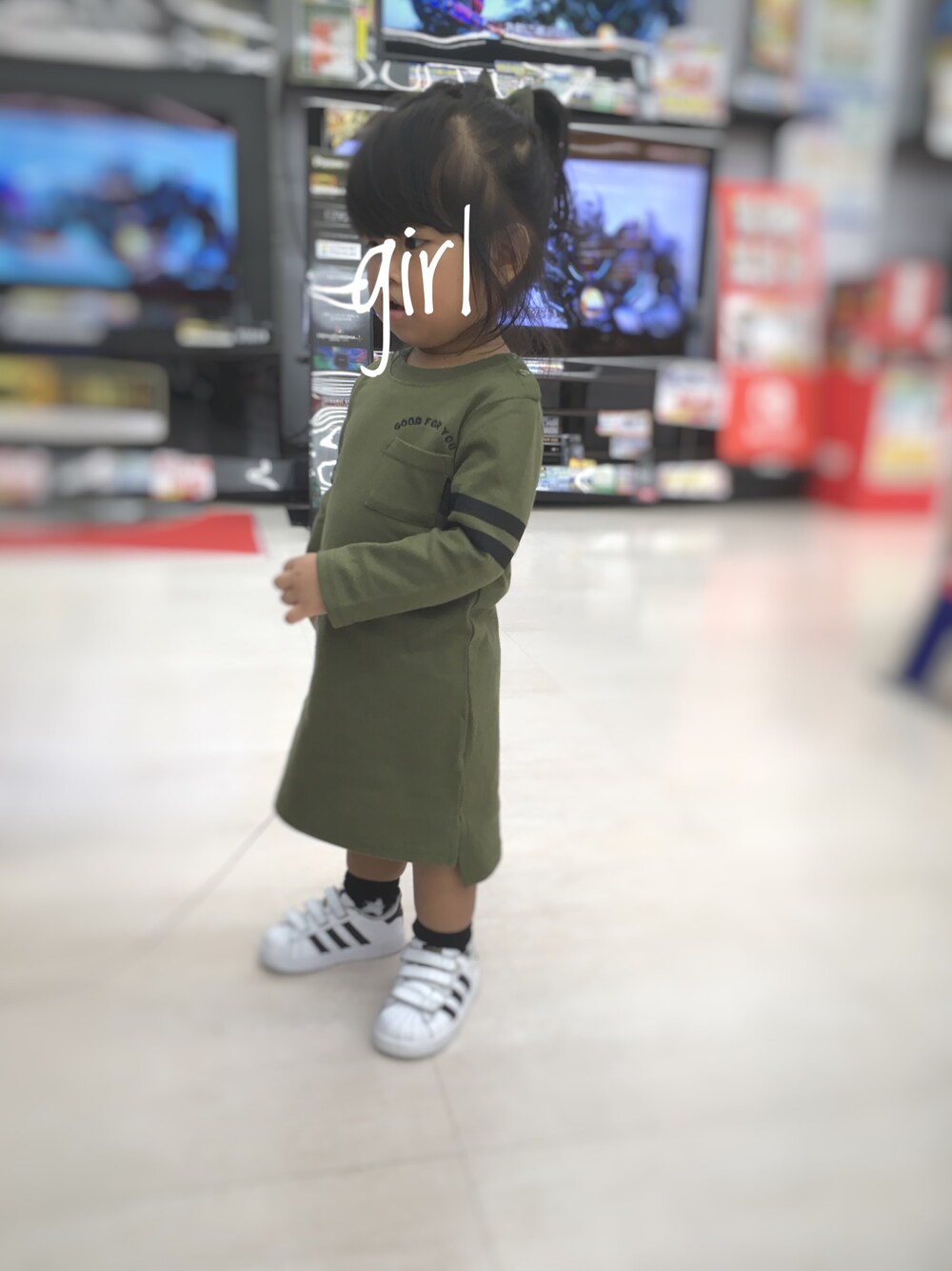 カーキのワンピ♡ 電気屋さんに行ったら テレビでアンパンマンが! エンディング曲で 踊り出す🎶