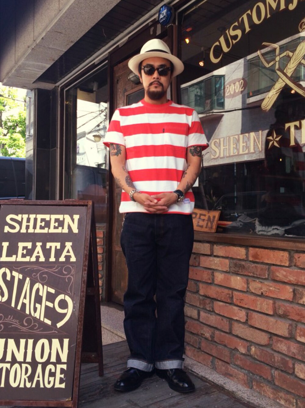 [Daily] TOP : Striped pocket short sleeve red HEADGEAR : LT Seoul hat ivory