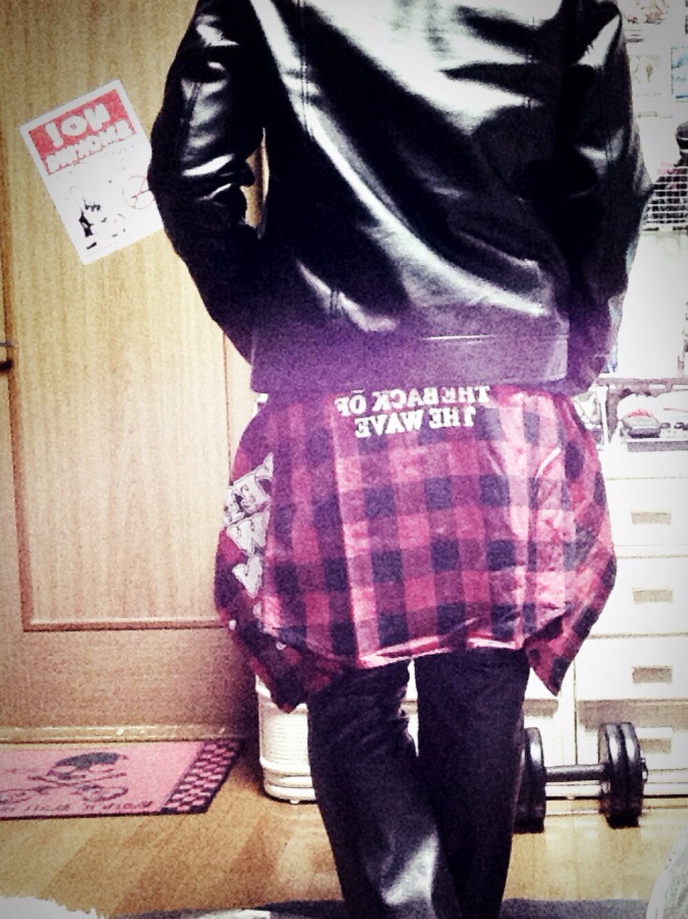 上下レザーにチェック柄カッターシャツを腰巻きして少しハードさを控えめに。レザーブーツはインしてました。