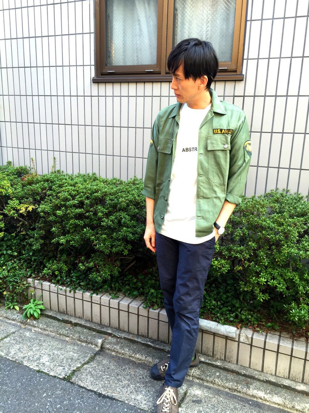今季一押しのSALVYのパンツを、vintageアイテムのカーキのミリタリージャケットで、カジュアルダウン。清潔感があるリラックススタイル。