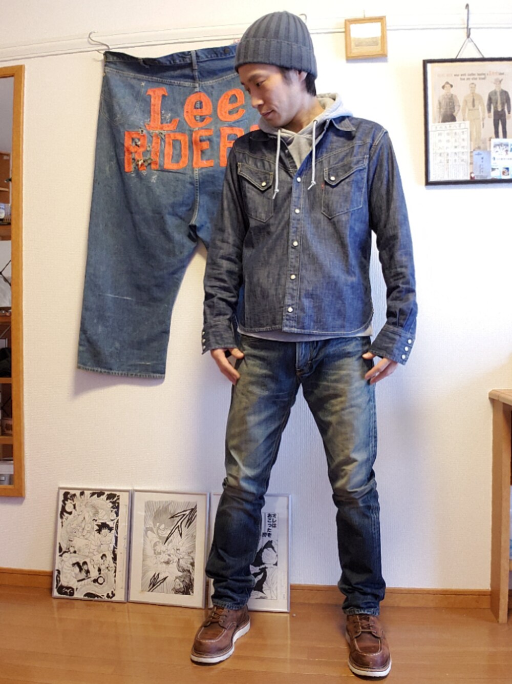 最近はワークブーツを中心にコーディネート デニムオンデニム難しいけど挑戦…大丈夫かな? デニムシャツ デニムパンツ スウェットパーカー ワークブーツ ニット帽