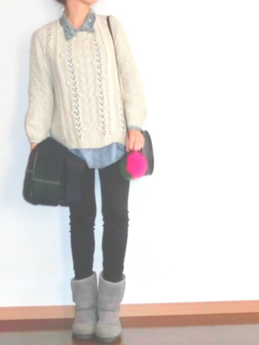撮りだめコーデ② いつものバッグにDHOLICのファーポンポンを付けて♡ ピンク×グリーン×ブラックのインパクト強めなファーがお気に入り♫
