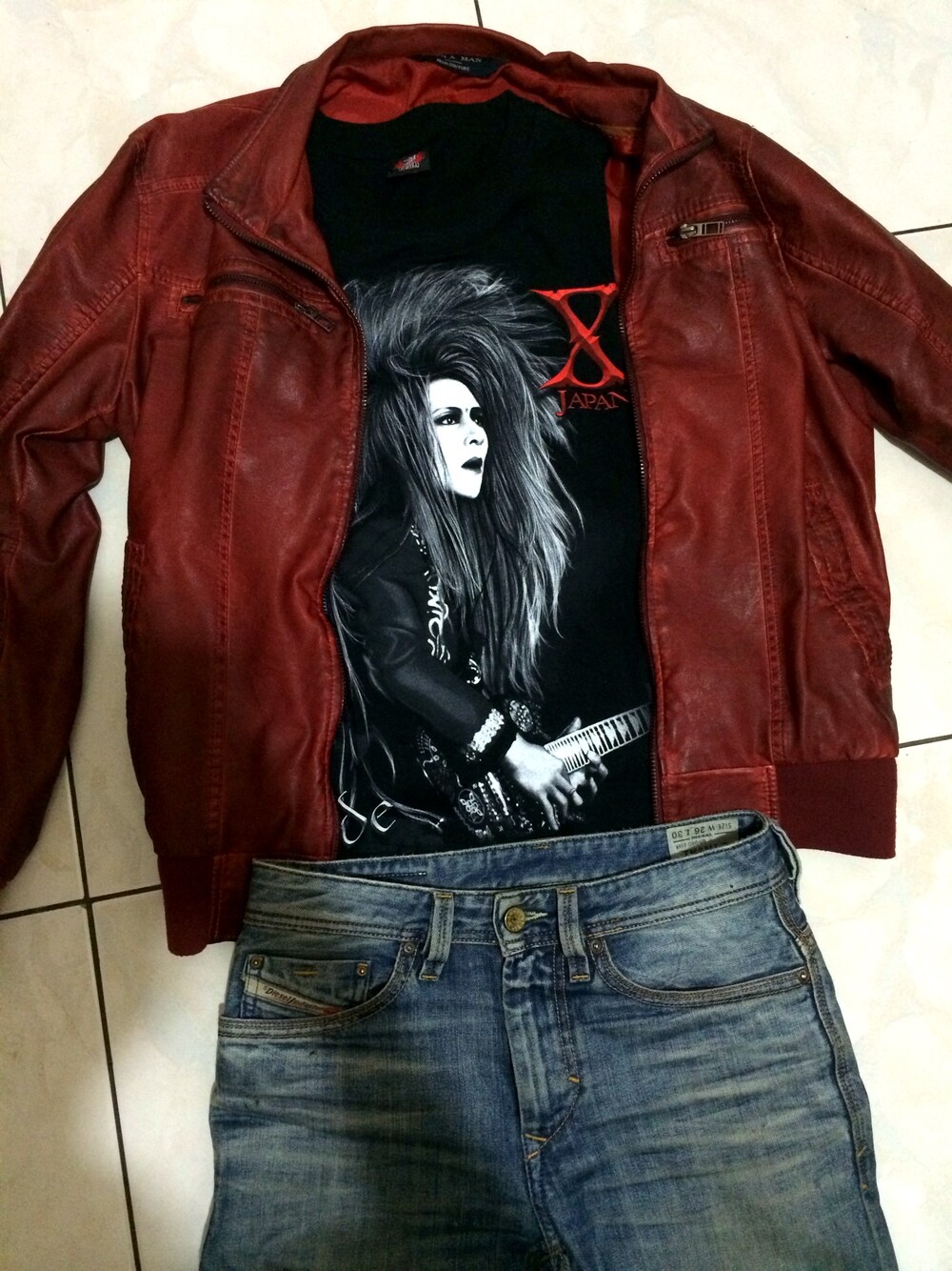 皮外套+牛仔褲搭配Hide 人物T恤,簡單!但是帥呆了.......(我說的是Hide)