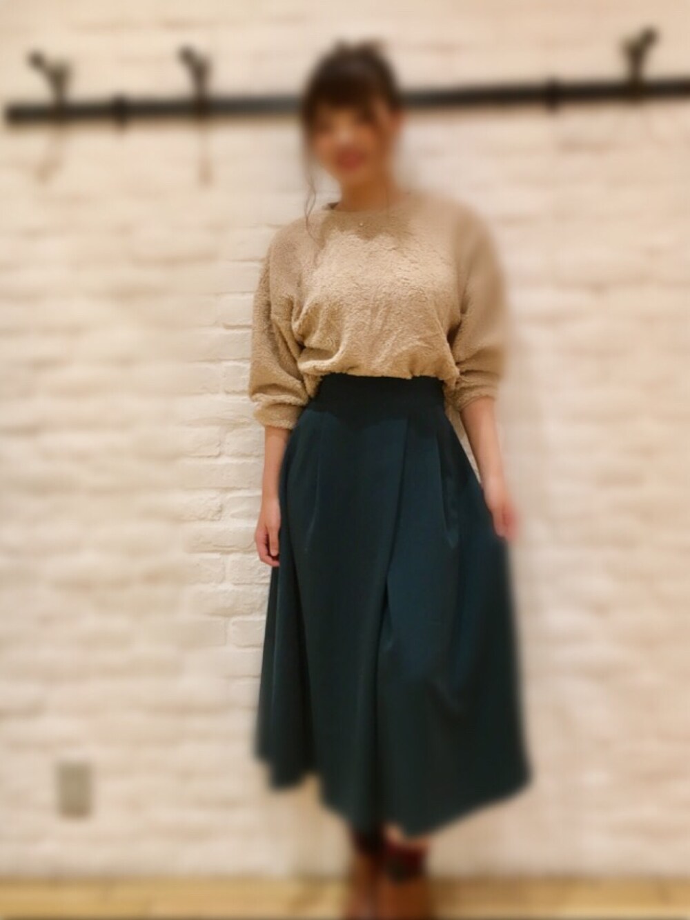 カラーで秋を意識。 でも本日は気温も低く肌寒いので トップスを今季トレンドの モコモコ系で寒さをカバー。 スカートはウエスト位置を変えると また雰囲気が違って◎ 靴下と合わせると秋の感じが より一層増します。
