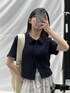 すこしぽこぽこした生地が夏らしい ミニ丈のシャツ 中央のボタンだけ閉めて 上下を開けると インナーがチラ見えするように着てみました キッチリ感がなくなるのでさらにカジュアルに着こなせます