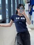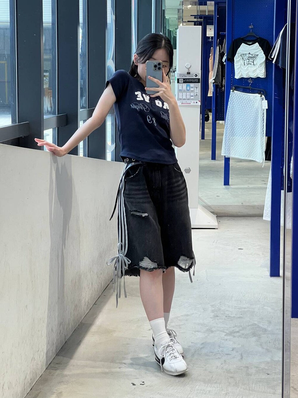 トップスは伸縮性がとても良く、 流行りのミニTでトレンドも押さえたアイテム デニムはウエストが結構大きめなのでベルトを使っています。