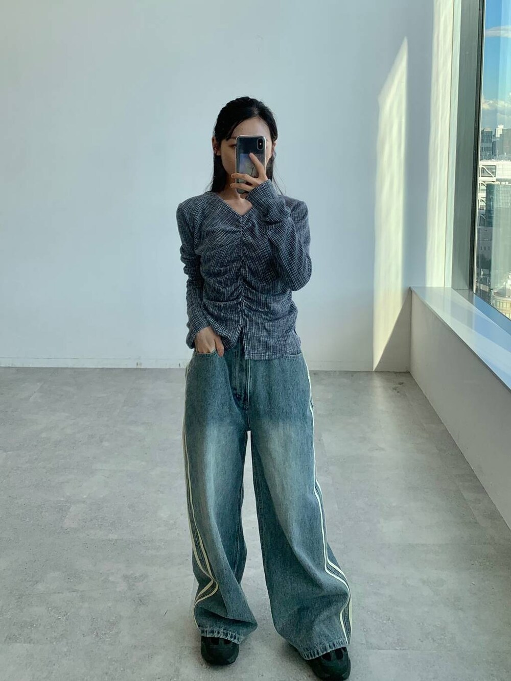 Vネックで首周りをスッキリ見せてくれるシャーリングトップス 模様が若干細かいボーダーの様になっているところがポイント 足を長く見せてくれるラインデニム