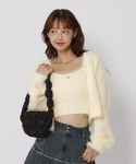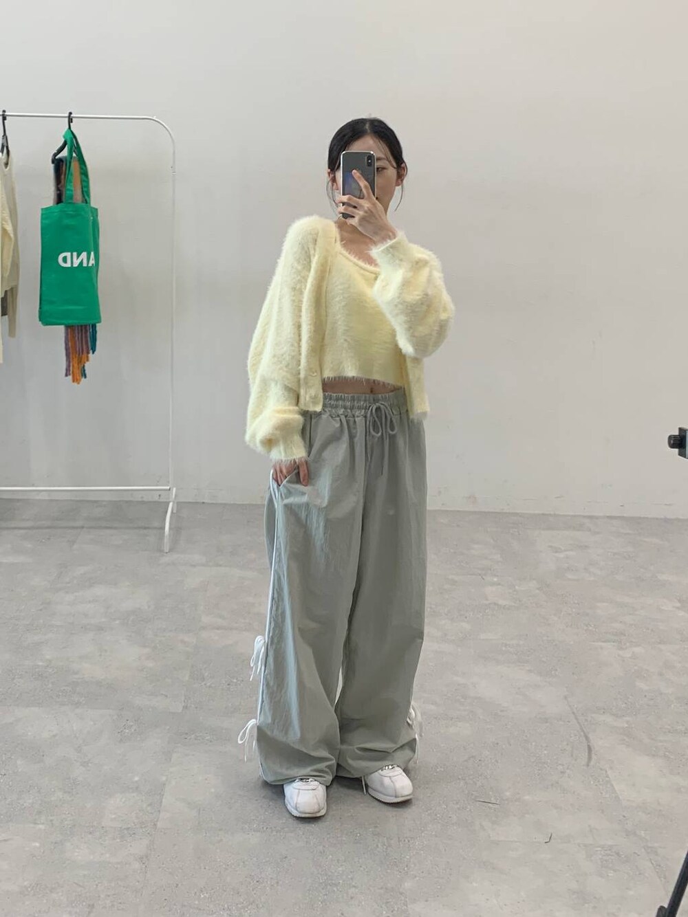 バラのついたキャミとカーディガンがセットになった フェミニンアイテムと カジュアルなナイロンパンツを合わせた ミックスコーデ