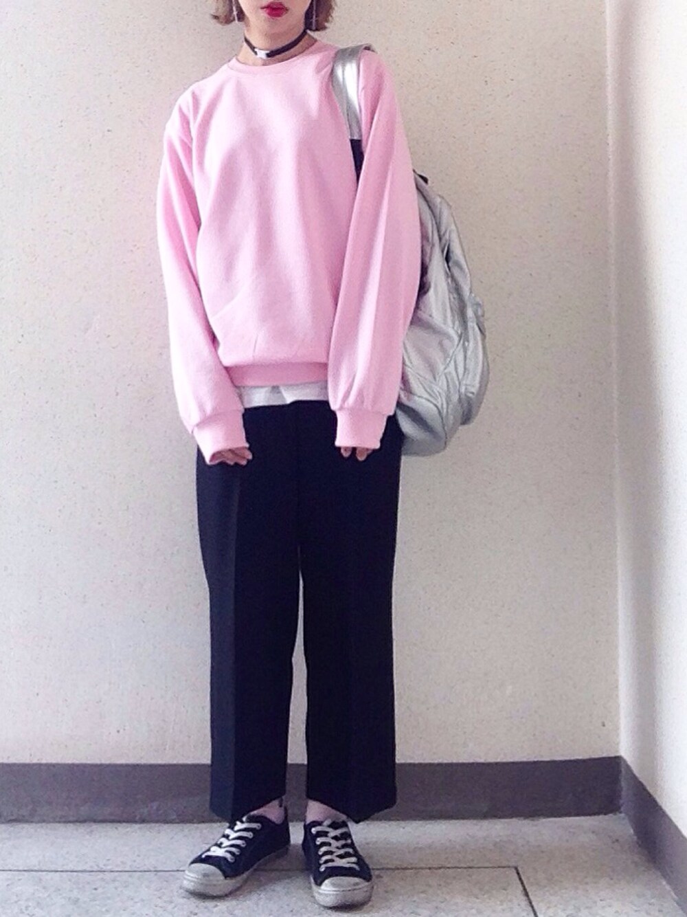 ピンク系のトップスを着用したレディースの秋コーディネートの1枚目の写真