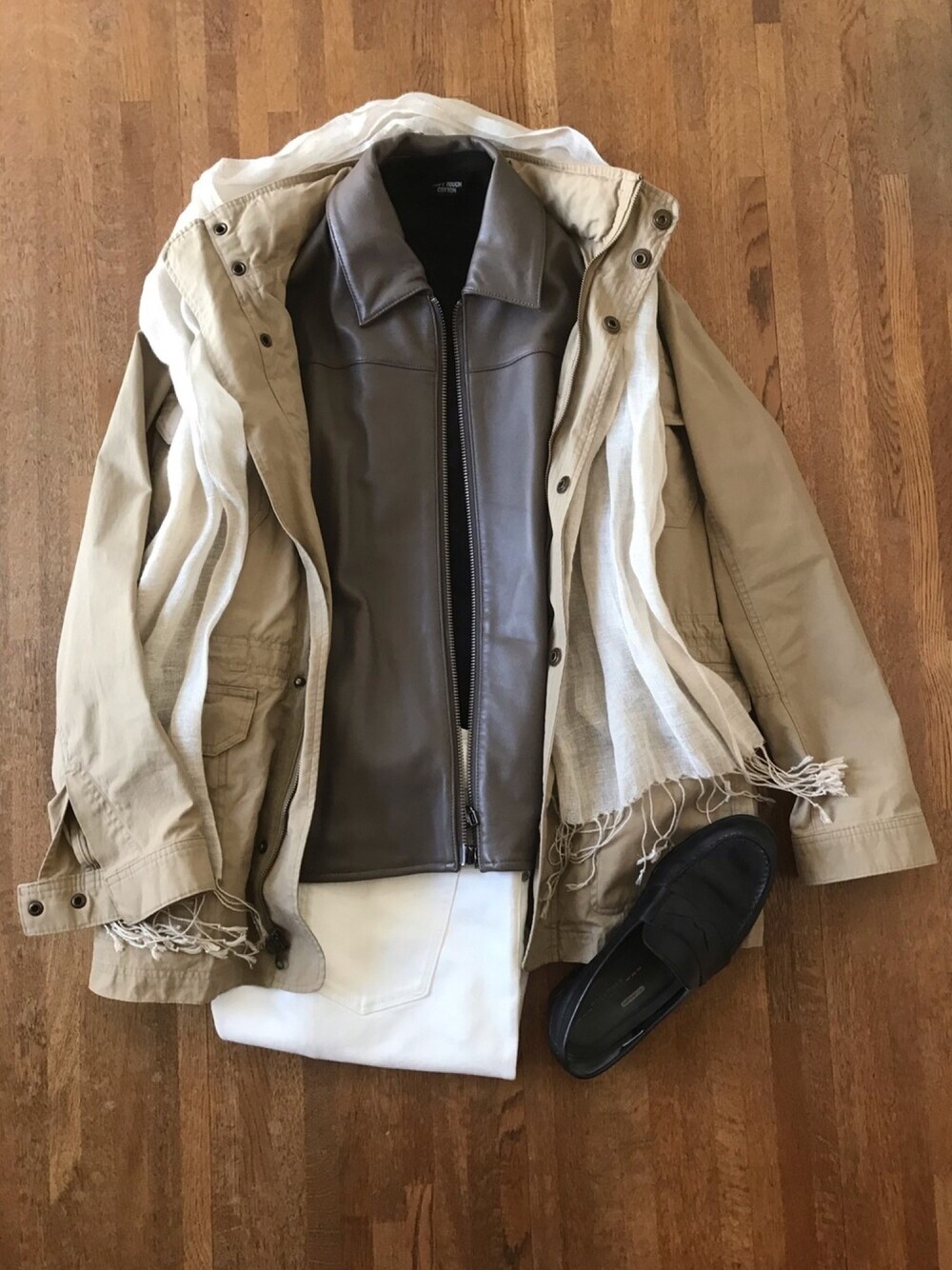 今日のコーディネート。 春ですが、また少し寒さが戻ってきたので、レザーブルゾンにフィールドコートをレイヤード。 カラーリングはベージュ系でまとめて、麻のストールをプラスして、春らしい感じに。インナーをブラックのカットソー、足元も、ブラックのスリップオンにして引き締めて見せます。