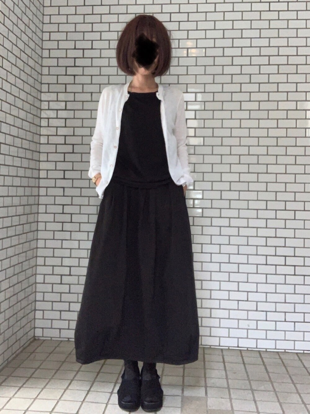 モノトーンコーデ 45Rの定番タンクトップとギマニットカーデ スカートは良品のバルーンを合わせて素材重視 今年の夏は、カンペールのサンダル2足で いけそうな気がする😊
