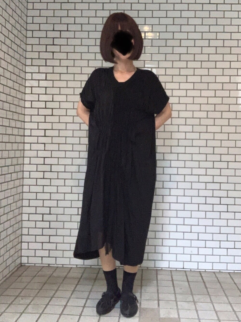 ブラックコーデ 蒸暑い日は汗をかいても乾きのいい素材 室内での羽織ものは必需品 靴はアウトレットでご購入 いつも出遅れるため、アウトレットは御用達 よく履くブランドのサイズ感はわかってるので 通販でも大丈夫😊