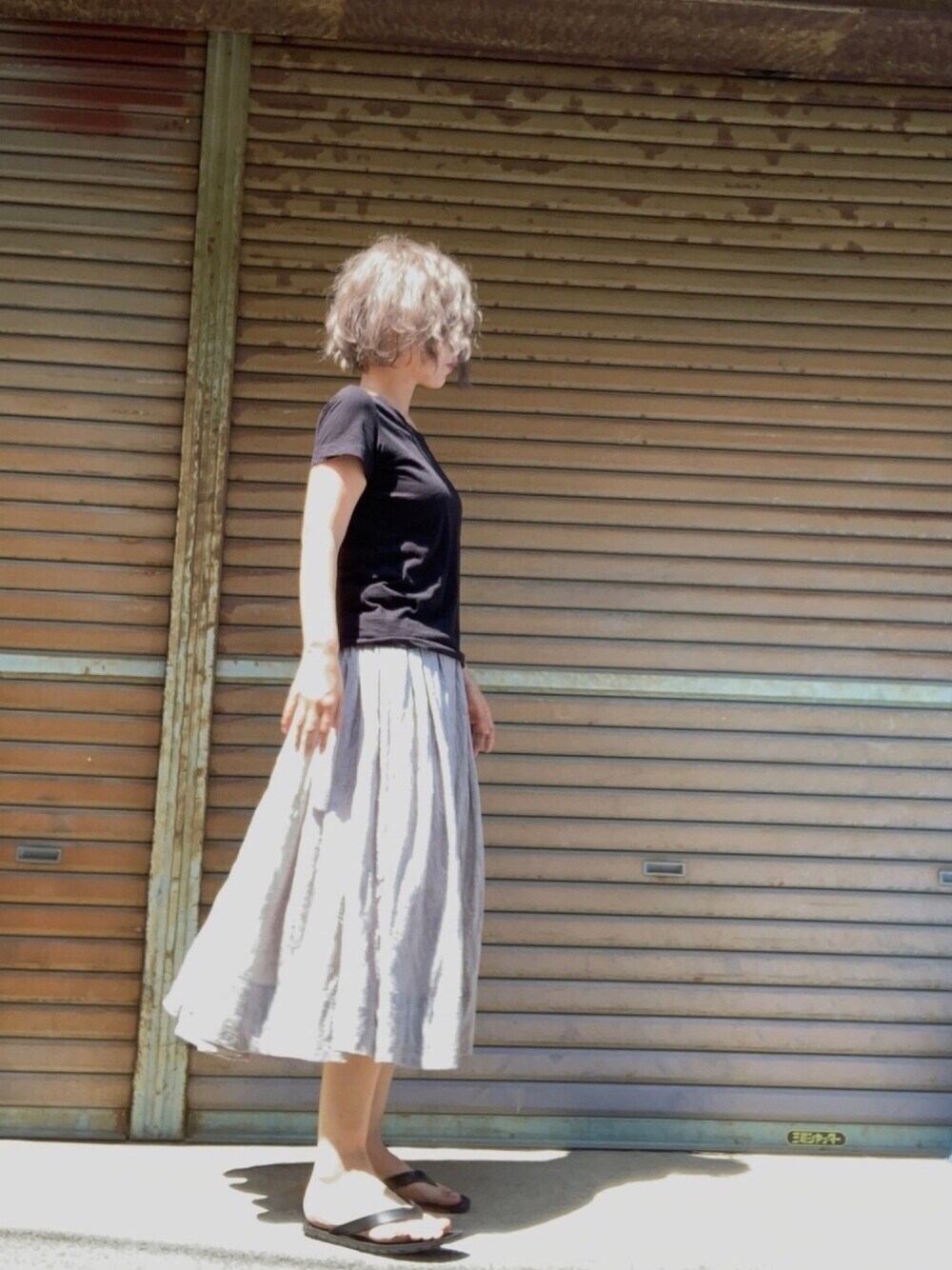 休日コーデ 連日の暑さで引きこもりなお盆休み 意を決して買い出しに行く姿です 今年お初のビーサンそんな履かないので かれこれ3年目くらいか スカートはグレーだけど日差しで白にしか見えない