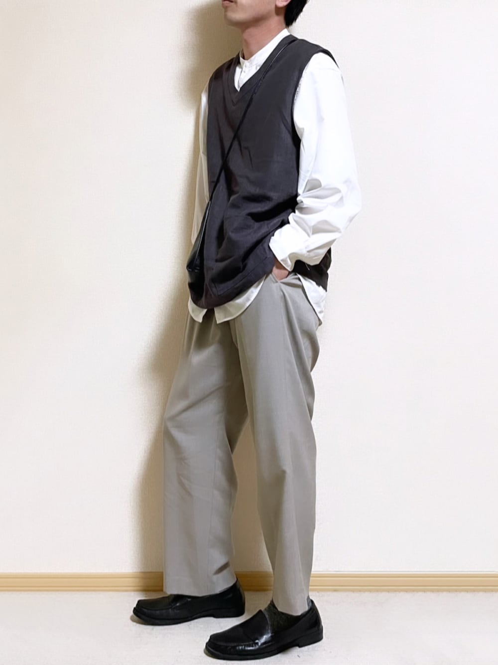 SHOTARO のベスト「ヴィンテージリネンルーズVネックオーバーサイズベスト」を使ったコーディネート
