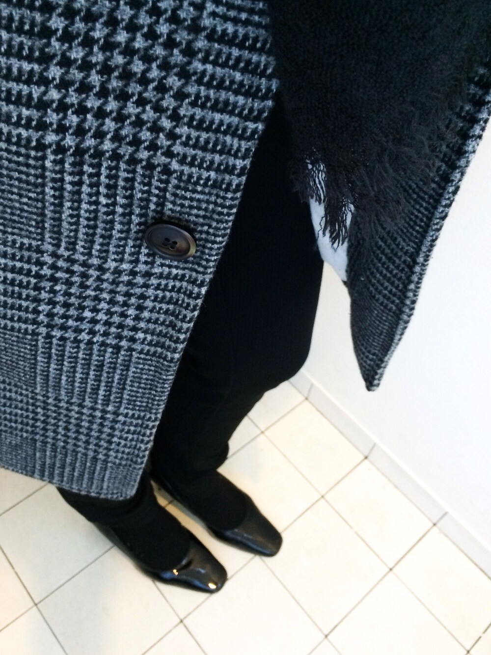 チェスターコート以外はブラック縛り コートの前をあけるとIライン 今日そとめっちゃあたたかいね ベストの中身は白いブラウス!