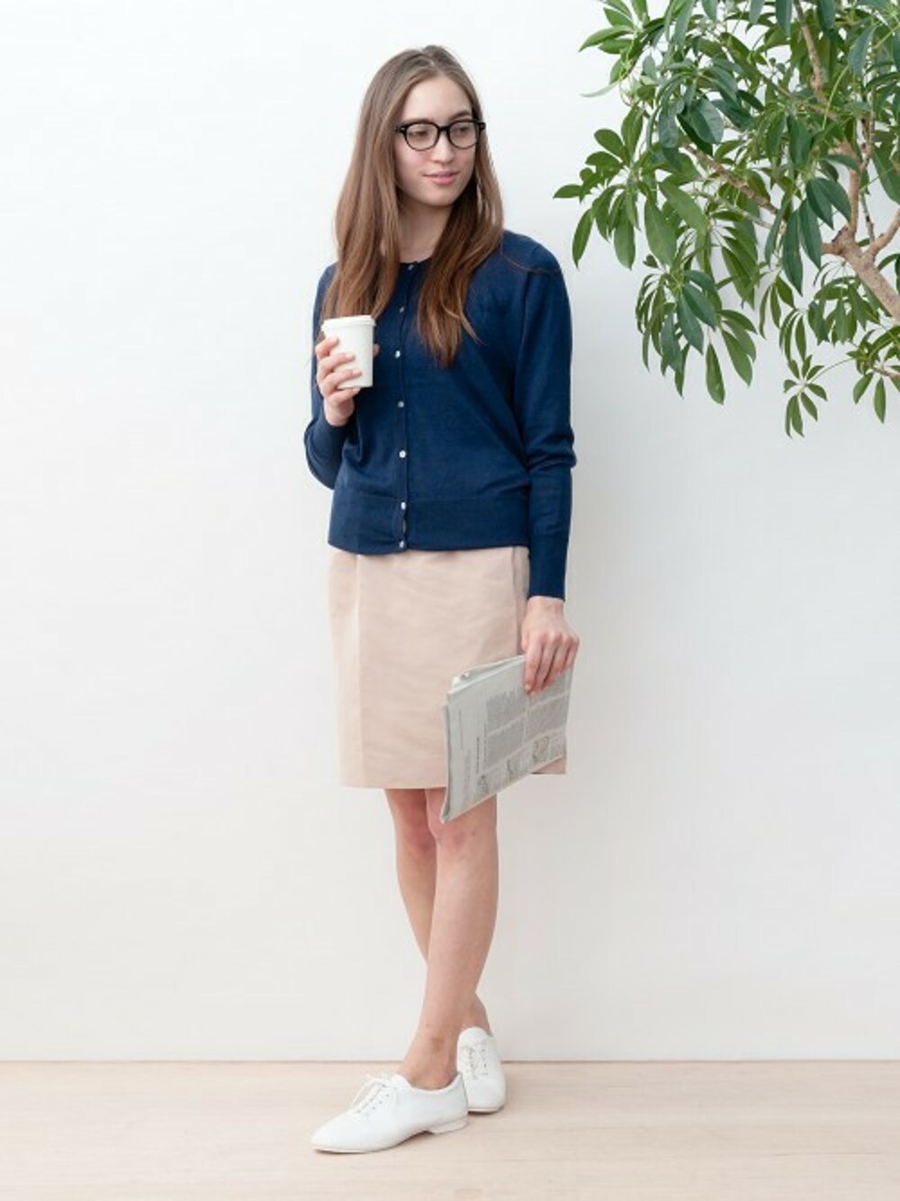 グログラン素材を使用したギャザースカートにはベーシックな薄手のカーディガンで。 足元は少しクラシックなホワイトのレースアップシューズを合わせるのがオススメ。